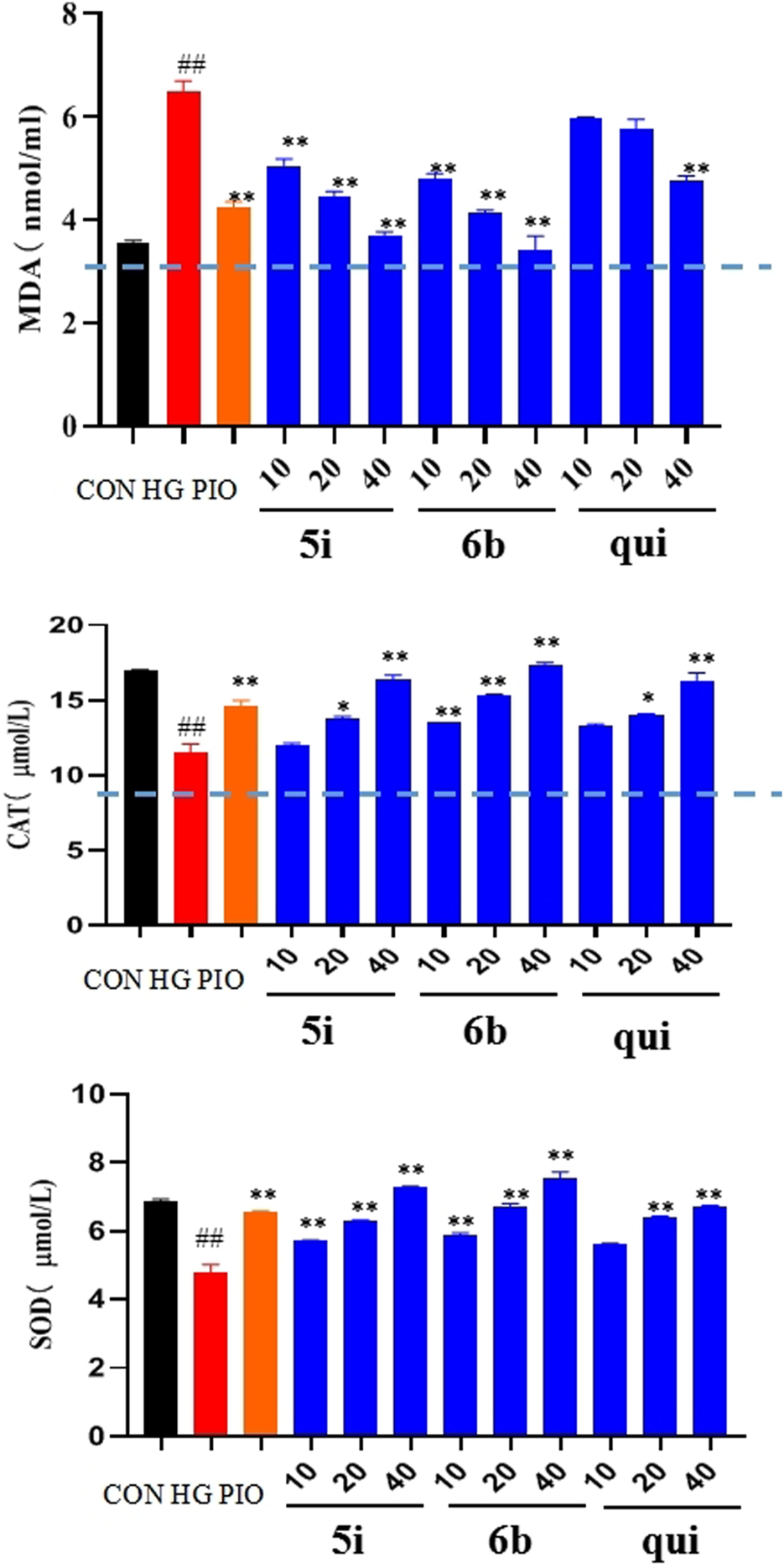 Effects of compounds 5i and 6b on the contents of MDA, SOD, and CAT in LO2 cells. LO2 cells were treated with compounds 5i and 6b (10, 20, 40 μM) dissolved in DMSO for 48 h. MDA, SOD, and CAT contents were determined using the appropriate ELISA kits. (# vs. CON, ##p < 0.01, * vs. HG, *p < 0.05, **p < 0.01, PIO, Pioglitazone; HG, High Glucose, qui: lead compound).