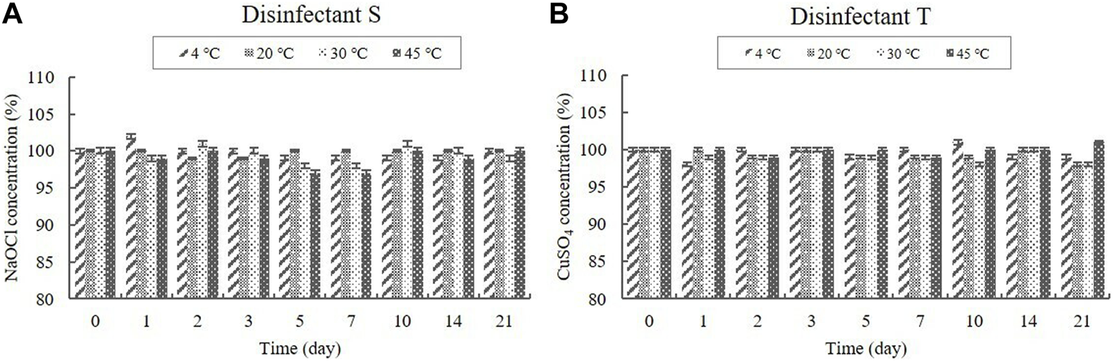 In this study we attempted to elucidate how the concentrations of the active ingredients of diluted disinfectant solutions and therefore their stabilities change under various storage conditions. The study included the assessment of the stability of diluted disinfectant solutions when exposed to a freezing/thawing cycle, to investigate the stability of diluted disinfectant solutions during January, known as the coldest month in South Korea with average temperatures reaching −6.9°C to 3.6°C (KMA, 2023). In the winter season, heat wires, thermostats, indoor storage, and other means are used to prevent freezing of the diluted disinfectant solutions as their stability when frozen has not been confirmed scientifically. We evaluated diluted disinfectant solutions of various chemical compositions in our study, including soaps and detergents, acids, oxidizing agents, aldehydes, and copper compounds, under various storage conditions (Table 1). These conditions were chosen to assess how specific storage conditions such as temperatures and storage times affect the efficacy of disinfectants. Concentration-based assays were performed to determine the changes in the contents of the active ingredients, thereby generating basic scientific data to establish the stabilities of the active ingredients, and to suggest suitable storage conditions for the diluted disinfectant solutions.