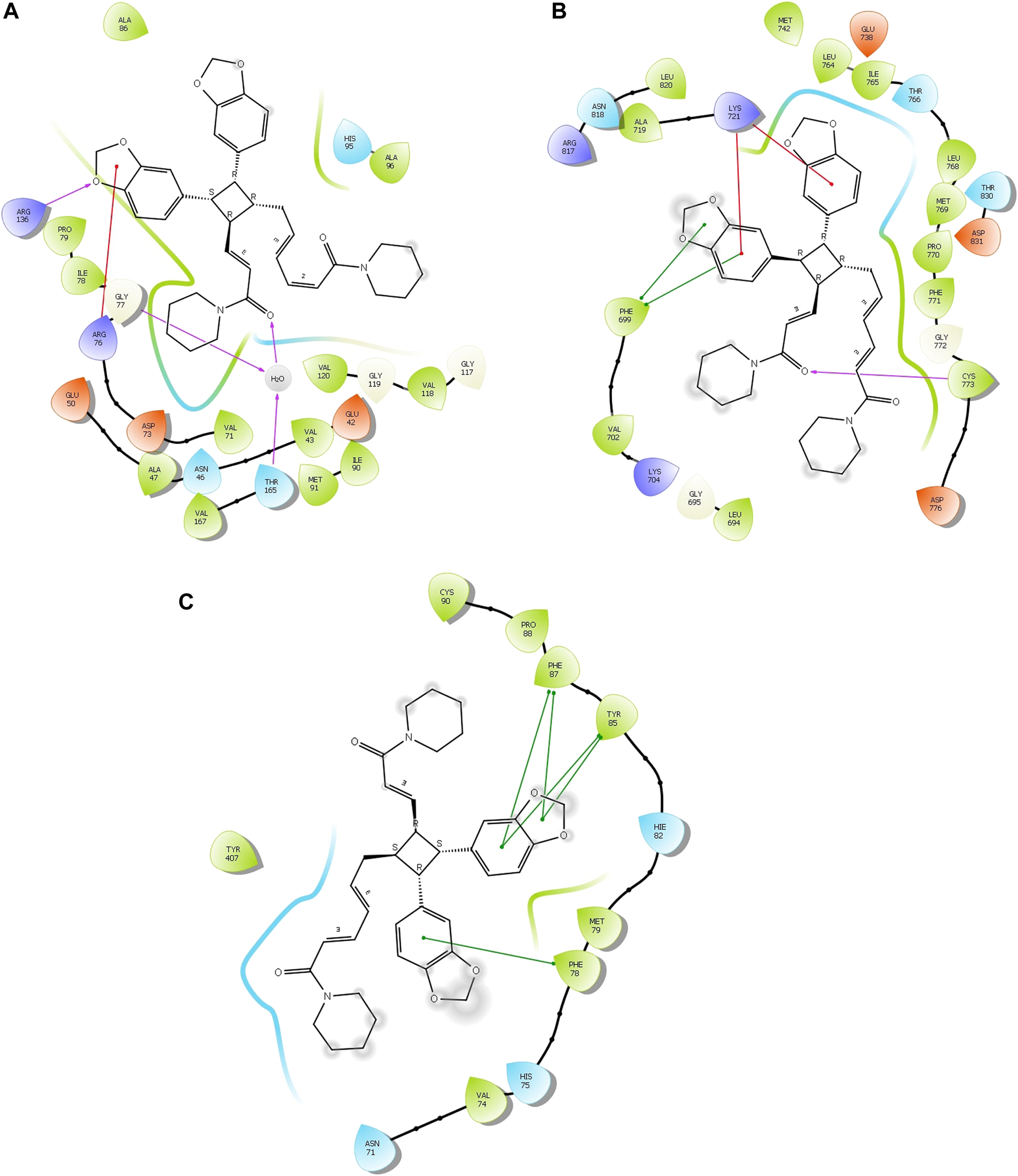 A total of 58 compounds were selected from the literature as the most bioactive components of P. nigrum fruits, specifically, alkamide/alkaloids. The molecular docking was designed to examine the binding sites of three proteins: glutathione reductase (Pdb ID: 1Xan), DNA gyrase (Pdb ID: 1Kzn), and EGFR (Pdb ID: 1m17). The X-ray crystal structures were downloaded from the Protein Data Bank (PDB) website (https://www.rcsb.org/), with their binding native ligands, HXP xanthene, clorobiocin, and erlotinib, respectively. The 3D chemical structures of the tested molecules and native ligands were prepared, and their energy was minimized by the MMFF94x force field using our previous protocol (Moussa et al., 2020). The computational study was performed using Discovery Studio 4.5 software at Ain Shams University, Faculty of Pharmacy, where ligands and enzymes were prepared using the molecular docking C-Docker protocols (Abdel Razek et al., 2020; Moussa et al., 2020; Ibrahim and Moussa, 2021).