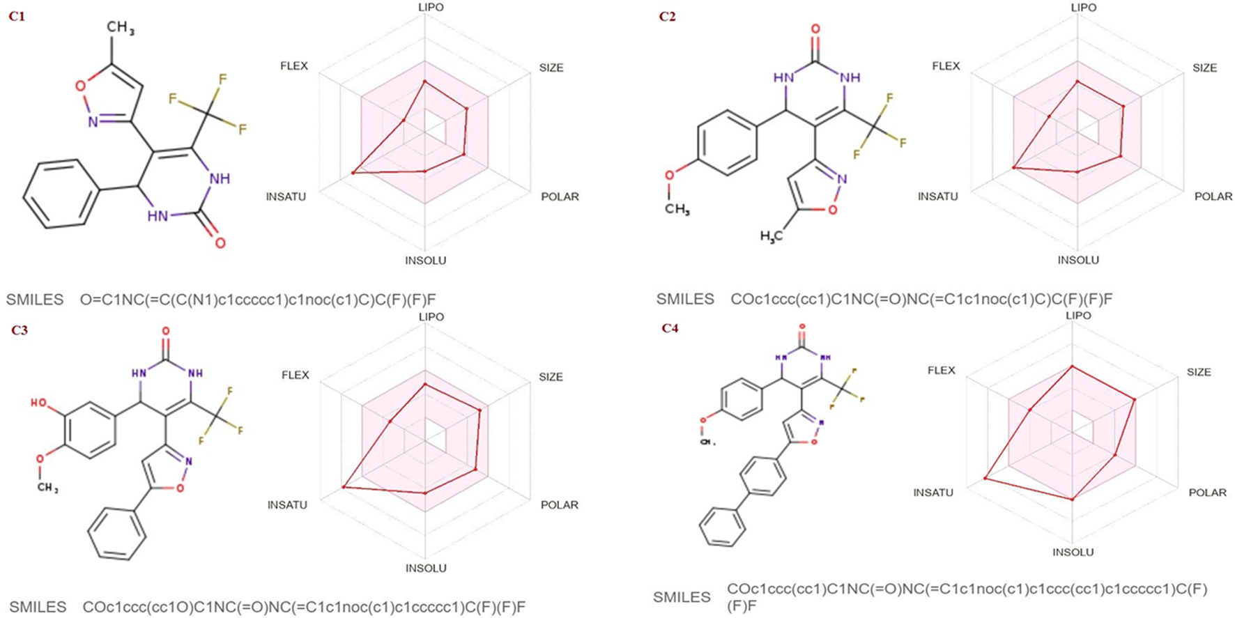 Drug-like chemical space refers to substances with pharmacokinetic properties that allow them to last through the conclusion of clinical trials (phase I) (Bade et al., 2010). The physicochemical properties of the compounds, including their lipophilic nature and water solubility, pharmacokinetics proficiency, drug resemblance, and pharmaceutical chemistry, were estimated using the SwissADME database. The oral bioavailability radar, often known as the BOILED-Egg graph, was created by analyzing physicochemical properties. The SwissADME database was used for generating this graph (Daina et al., 2017; Ahmad et al., 2021).
