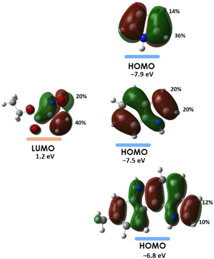 Frontier Molecular Orbital (FMO) analysis of the hetero-Diels–Alder reaction of ethyl nitrosoacrylate (2a) with pyrrole, indole and pyrrolo[3,2-c]carbazole 10 was carried out. The relative energy values of the HOMO and LUMO orbitals of the reactants were obtained at the HF/6-31G (d,p) level of theory (Figure 5). The results show that the energy difference between the LUMO of the nitrosoalkene and the HOMO of the heterocycles is smaller (between 7.99 and 9.08 eV) than that calculated for the HOMOnitrosoalkene-LUMOheterocycle pair (between 14.03 and 16.51 eV). Thus, the results show that these reactions are LUMOnitrosoalkene-HOMOheterocycle controlled and confirm that pyrrole, indole and 8-methyl-1,6-dihydropyrrolo [3,2-c]carbazole participate in inverse electron-demand hetero-Diels-Alder reaction with nitrosoalkene 2a acting as electron-rich 2π component. Furthermore, FMO analysis indicates that the molecular orbital energy profile of 8-methyl-1,6-dihydropyrrolo[3,2-c]carbazole is closer to the one of indole than to pyrrole.