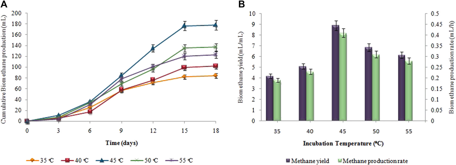 (A) Cumulative CH4 production (mL), (B) CH4 yield (mL/mL) and production rate (mL/h) at different incubation temperatures.
