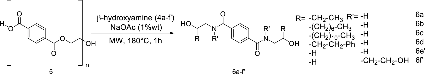 Cut-pieces (2–5 mm) of PET bottles were washed with fresh acetone three times and then dried in an oven at 50°C. Using a Mixer Mill MM 500 nano, the PET pieces were ground to obtain dust scale particles. Depolymerization was performed at 180°C for 1 h under microwave irradiation using a Biotage® Initiator +. In a microwave vial, β-hydroxy amines and PET were reacted in a 2:1 wt. ratio using sodium acetate (1wt.%) as a catalyst. Finally, the depolymerisation products were purified by recrystallization using different solvents and dried in an oven at 50°C (Scheme 2). The compounds 6a, 6b and 6e’ were recrystallized from a water solution. The compound 6c was recrystallized from a solution of NaOH (10 M). The compound 6f’ was recrystallized from a solution of hot MeOH and EtOAc. The compound 6d was recrystallized from a solution of DMF and EtOH.