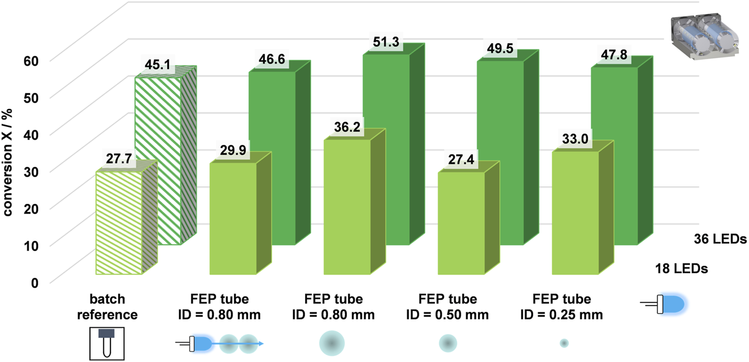 The bar plots for 18 LEDs include the batch reference with 27.7% conversion. When analyzing the inner diameters of 0.8 mm for single and double coiling, it was observed that double coiling the tube resulted in fewer photons reaching the reaction medium. Specifically, the conversion was 29.9%, and no significant increase in conversion was observed compared to batch. However, the single coiling of the largest inner diameter of 0.8 mm produced the highest conversion of 36.2% for 1 min irradiation with 18 LEDs. Varying the inner diameter did not significantly increase conversion. Furthermore, decreasing the inner diameter to 0.25 mm increases the wall thickness while maintaining the same outer diameter of 1.6 mm. In the next set of experiments, the number of LEDs used was doubled from 18 to 36. This change resulted in a significant increase in the number of photons introduced into the reaction system. As a result, all conversions of the pinacol coupling reaction were higher than with the original 18 LEDs. By doubling the number of LEDs, it was possible to increase the conversion for the batch reference from 27.7% to 45.1%. The trend was also confirmed that the flow conversion for a single coiled tube with an inner diameter of 0.8 mm was higher than the batch reference. Doubling the number of LEDs increased the flow conversion in the same way by 36%, from 36.2% to 51.3%. Additionally, it was observed that double coiling did not provide any advantages for the conversions. In fact, the conversion rate decreased slightly, as expected for model reactions conducted with smaller inner diameters. However, this demonstrated that comparable conversions were possible for smaller reactor volumes, which DELT benefits from, as reactions for DNA-encoded chemistry were typically conducted on a µL-scale in batches. In summary, the most notable impact was observed, when the number of LEDs was doubled. Conversely, varying the inner diameters had no significant impact on the conversion rate of the model reaction.