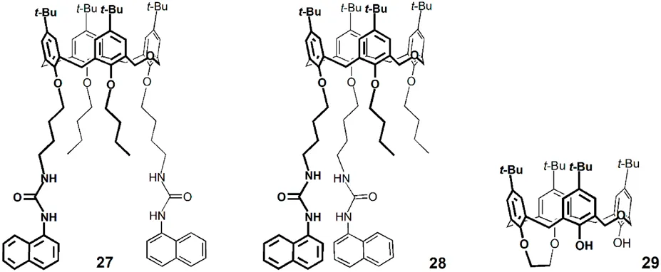Fluorescent dihomooxa receptors containing two naphthyl urea moieties in distal (27) or proximal (28) positions at the lower rim were obtained in the cone conformation (Miranda et al., 2020). Fluorescence titrations showed an increase of the emission intensity upon addition of F−, AcO− and H2PO4−anions, while a quenching of the fluorescence intensity was observed in the case of Cl− and BzO−. The fluorescence lifetimes of the 1:1 complexes in the case of Cl− anion showed a moderate decrease compared to those of the free receptors, while the quantum yields dropped significantly (Table 2). This indicates the existence of a marked static quenching in the complexes. The quenching was similar with respect to both intensity and lifetimes in the case of BzO−, arising mainly from an increase in the nonradiative decay constant in the complex, where aromatic moieties of receptor and anion appear to interact. The highest association constants determined by fluorescence in CH2Cl2 were found for F−, AcO− and BzO− anions, and proximal naphthyl urea 28 was a slightly better receptor than distal 27. These results were corroborated by DFT calculations (B3LYP/6-31G(d,p) level).