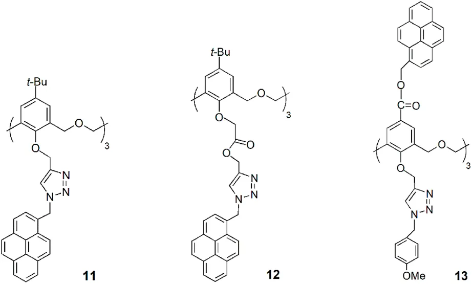 A new hexahomotrioxa chemosensor 13 bearing a fluorophore pyrene at the upper rim of the calixarene and an ionophore triazole unit at the lower rim was developed and showed different cation sensing behaviours (Wu et al., 2015). According to 1H NMR titration experiments, the transition and heavy metal ions Zn2+, Cu2+, Hg2+ and Pb2+ are bound by the three triazole moieties, resulting in a conformational change, that causes an increase of the monomer emission intensity and an excimer quenching, while in the case of Fe3+ binding, which takes place at the macrocycle cavity, the approach of the pyrene units produces an increase of the emission intensity of the excimer. The highest Kass was obtained for the 1:1 complex of 13-Pb2+ with the value of 6.88 × 105 M−1 in MeCN. The authors believe that the calixarene scaffold acts as a spacer, preventing a significant metal cation-fluorophore interaction, thus preventing the heavy atom effect.