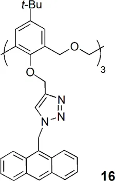 A new type of fluorescent sensor (16) containing triazole groups as the binding site and anthracene as the fluorogenic unit on the lower rim of a hexahomotrioxacalix[3]arene was obtained in the cone conformation (Jiang et al., 2016). Compound 16 showed a very high selectivity for Zn2+ and Cd2+, even in the presence of excess of competing metal ions, behaving as a fluorescence enhancement type chemosensor. 1H NMR experiments indicated that upon Zn2+ binding the macrocycle cavity changes from a flattened-cone to a more upright form, and the anthracene moieties move away from each other, reducing the π-π stacking and causing fluorescent enhancement. By other side, 16 presented as a fluorescence quenching type chemosensor toward Cu2+ and Fe3+ ions, due to the PET process or the heavy atom effect.