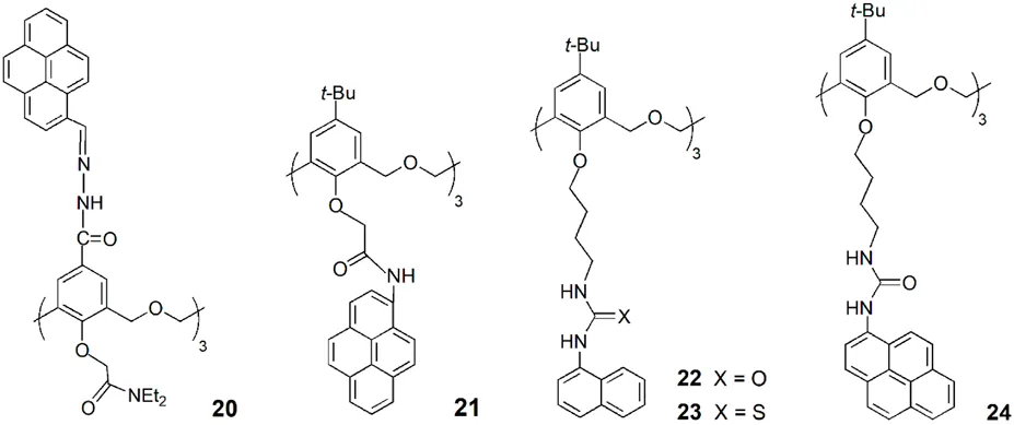 The anion binding properties of three fluorescent (thio)ureido-hexahomotrioxa receptors bearing naphthyl or pyrenyl residues at the lower rim and presenting the partial cone conformation (22–24) were investigated by Marcos and coworkers (Miranda et al., 2022). The results obtained by NMR, UV-Vis absorption and fluorescence titrations showed that the association constants for the 1:1 complexes increase with the anion basicity in general for all the receptors. The halide F− and the carboxylates AcO− and BzO− were the best bound anions and the pyrenyl urea derivative (24) the more efficient receptor (log Kass = 3.31, 3.42 and 3.45, respectively, determined by NMR in CDCl3). Thermodynamics data were obtained for 22 with F− and AcO− anions by UV-Vis and fluorescence in acetonitrile and indicated that the binding process is entropy-driven. The computational studies carried out pointed to the critical role of the solvent on the anion-receptor association. Compounds 22 and 24 were also tested as ditopic receptors in the recognition of n-alkylammonium chlorides, but at low temperature (233 K in CDCl3) the association/dissociation process was still fast on the NMR time scale.