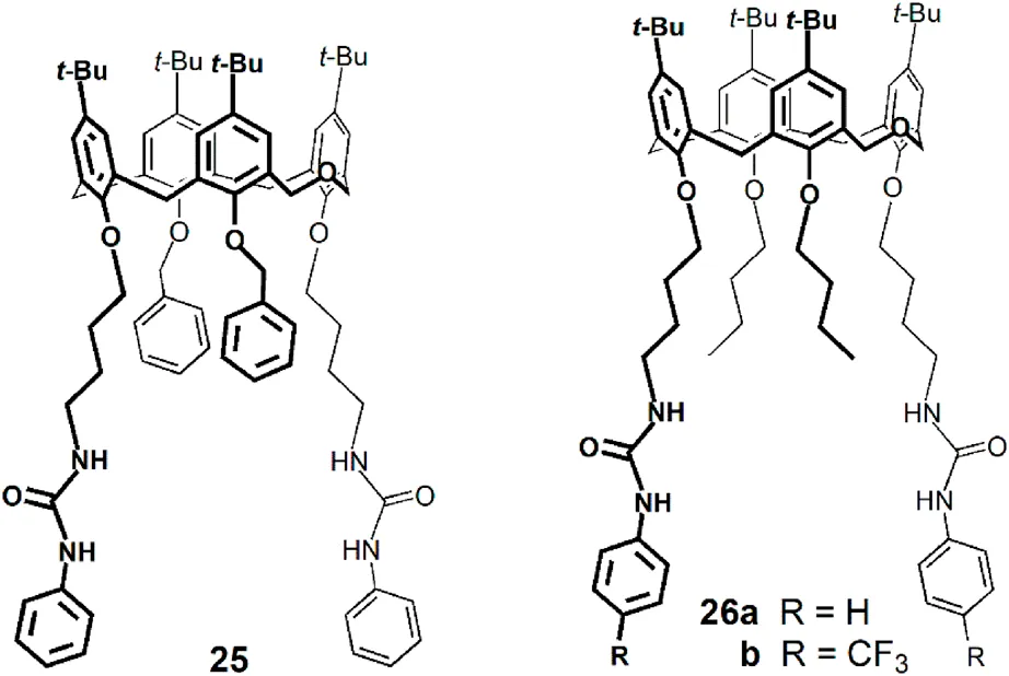 Taking advantage of the intrinsic fluorescence of dihomooxacalix[4]arenes, some derivatives have been investigated concerning their anion complexation properties, mainly by Marcos, Berberan-Santos and coworkers. The binding affinity of dihomooxa phenylureas 25 and 26 towards NO3− and HSO4− anions was determined by steady-state fluorescence (Miranda et al., 2017). An increase of the emission intensity was observed in all cases. Both receptors showed slightly higher association constants for HSO4− and phenylurea 25 exhibited a more effective behaviour as anion receptor than 26a. The NO3− and HSO4− binding constants were also determined by fluorescence in CH2Cl2 with the electron-withdrawing receptor 26b (Miranda et al., 2019). As expected, the constants were higher than those obtained for 26a, but followed the same trend.