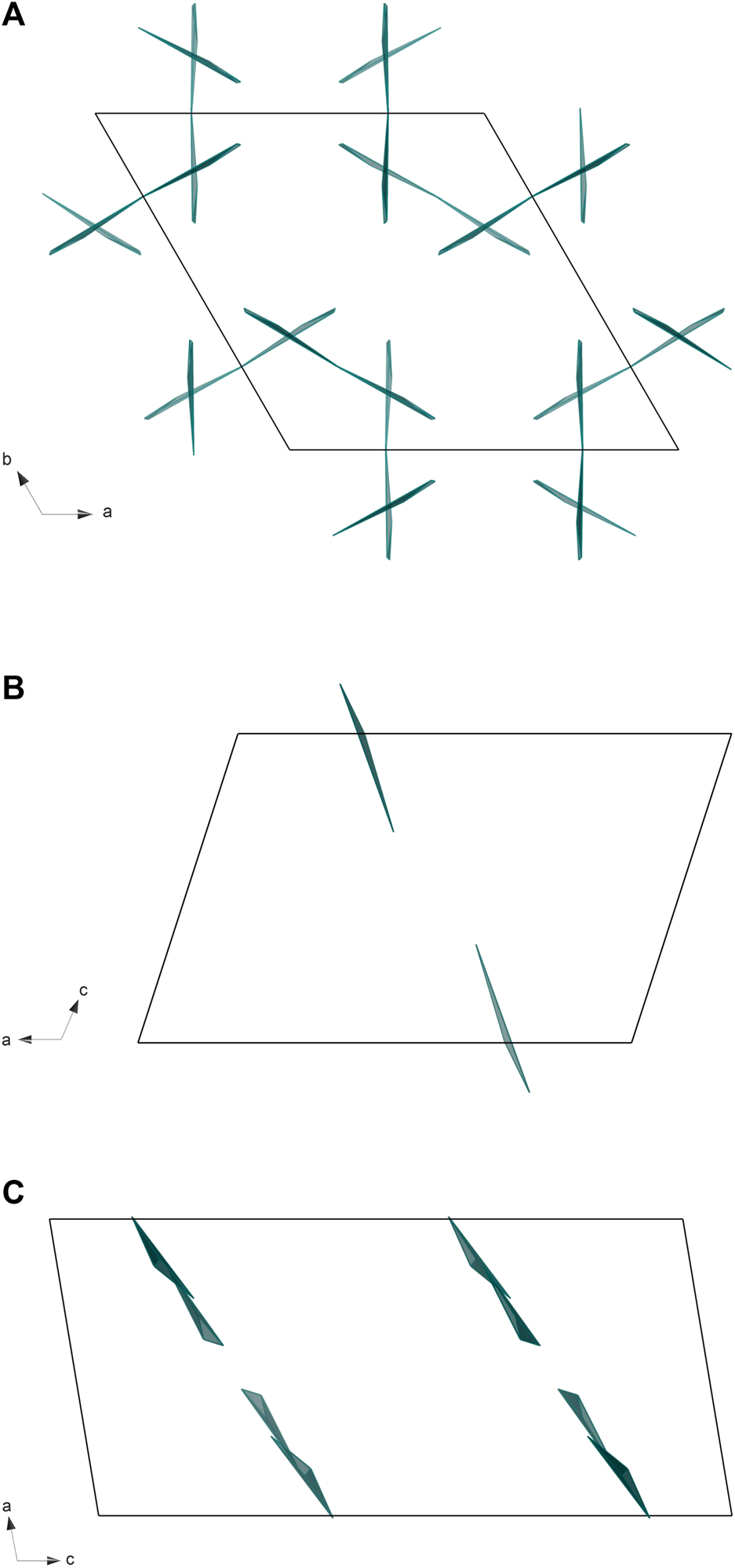 FIGURE 5. The comparison of BO3 polyhedra arrangement for: (A) La2B2O5(OH)2 (present work), (B) H-LaBO3 (ICSD 15383), and (C) La26(BO3)8O27 (ICSD 82308). For convenience, only BO3 polyhedra are shown.