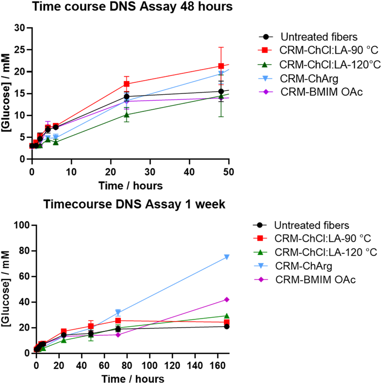 Pretreated fibers with ILs and NADES were treated with a broad spectrum cellulase enzyme mix, and untreated fibers were used as a control. A weeklong digestion was used to evaluate the effectiveness of the ILs and NADES pretreatment. Furthermore, a time course DNS assay was performed to evaluate the initial rate of the enzyme activity. CRM-ChCl:LA-90°C shows the highest initial rate, producing the most soluble sugar in the first 48 h (Figure 5). The lowest initial rate was observed for fibers pretreated with ChArg. However, after 1 week CRM-ChArg showed the greatest amount of soluble reducing sugar and the greatest mass loss, followed by CRM-BMIM OAc and last CRM-ChCl:LA (either for treatment performed at 90°C and 120°C) (Figures 5, 6). The fractions obtained with both CRM-ChCl:LA pretreatments displayed results similar to the control sample (untreated fibers) after 1 week of incubation with enzyme (Figure 6). This would suggest that the pretreatment with ChArg leads to greater removal of lignin and consequent increased cellulose accessibility, followed by the pretreatment with BMIMOAc and ChCl:LA. These data are in agreement with the FTIR and TGA analyses of the CRM-fractions subjected to the enzymatic treatment. Indeed, they confirmed the obtainment of a fraction enriched in cellulose only after ChArg pretreatment.