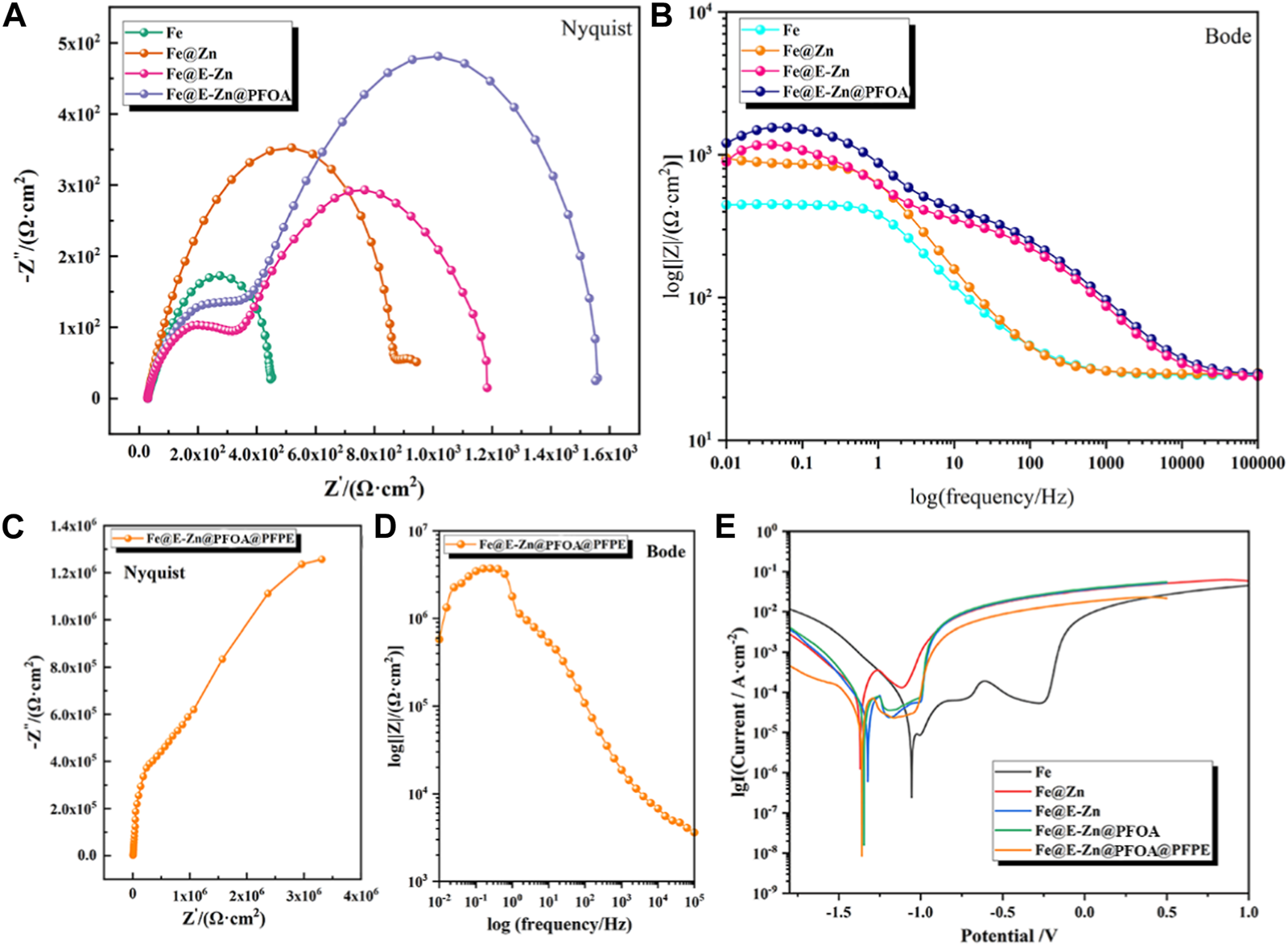 Anti-corrosion property of the different samples. Nyquist plots (A,C), Bode plots (B,D), and Tafel plots (E) of the different samples.