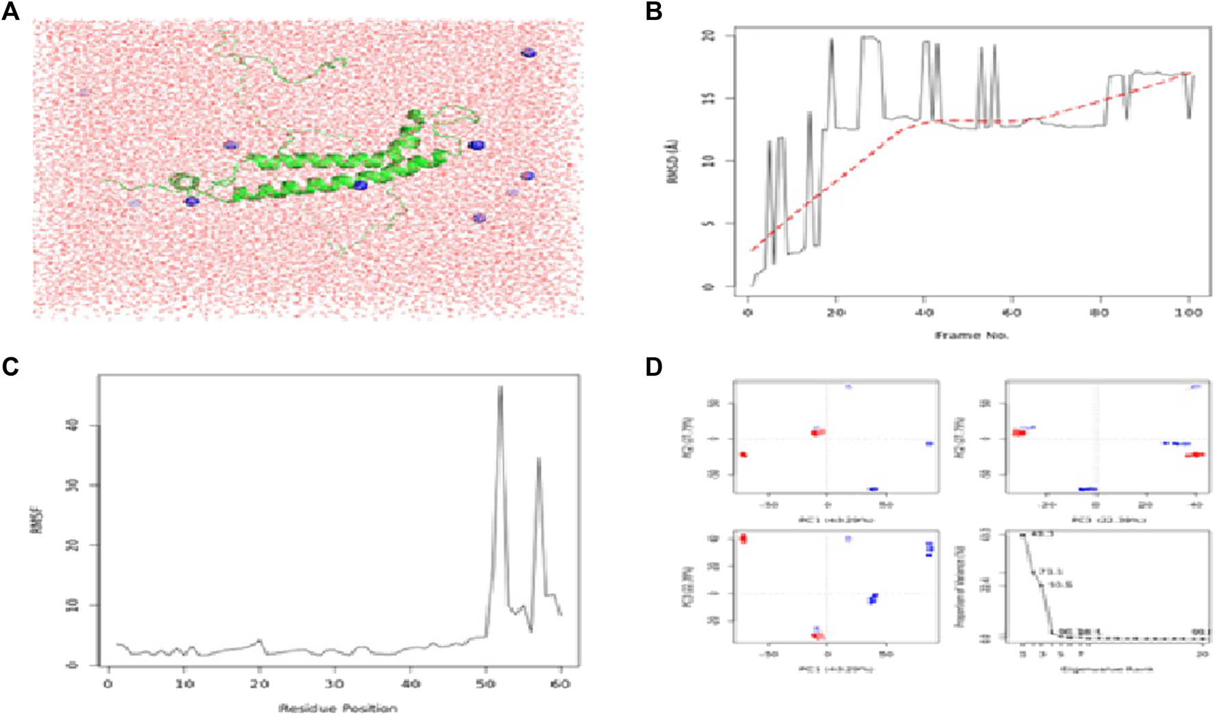 Once the key roles of target genes are identified, these common target genes are selected for docking and MD simulations with flaxseed (α-linolenic acid). Molecular docking in drug discovery plays a vital role as it includes structure–activity relationship (SAR), lead optimization, finds potential leads through virtual screening, and provides binding measures to facilitate predictions for inhibitors (Schleinkofer et al., 2006). The 3D structures of the selected three target proteins are obtained from the EBI AlphaFold2 database (Jumper et al., 2021) (EMBL-EBI alphafold, 2023). These three target proteins are CCDC28b (Q9BUN5), PDCD61P (UniProt ID: Q8WUM4), and USP34 (UniProt ID: Q9P2H5) with source species as Homo sapiens. The lower energy minima structure with no negative frequency of flaxseed (α-linolenic acid) is selected for the target–ligand interaction. The binding energies of target–flaxseed complexes are calculated with AutoDock tools (Morris et al., 2009). The output structures of these docked structures are used as input for energy minimization and MD simulations with the Galaxy webserver platform (Galaxy webserver; usegalaxy.org). The Galaxy platform is used for high-throughput molecular dynamics simulation to study protein–ligand interactions using the open-source GROMACS tools. For protein topology, the TIP3P model with an AMBER99SB force field is used. Ligand topology is generated by the GAFF force field with default BCC charge method (0 charge, multiplicity 1). The simulation box is created with box dimensions of 1.0 nm and triclinic shape for energy minimization. The system is charged (depending on the pH) with water as a solvent, and it also adds sodium or chloride ions (replacing existing water molecules) as per requirement for neutralization. The EM tolerance = 1,000, and 50,000 steps are considered for energy minimization. Energy minimization (EM) is used to relax the structure, and any steric clashes or unusual geometry are removed. The equilibration of the solvent around the solute (i.e., the protein) is performed in two steps; the equilibration under an NVT (or isothermal–isochoric) ensemble, followed by an NPT (or isothermal–isobaric) ensemble. For NVT and NPT calculations, the following parameters are used: bond constraints (constraints)—all bonds, temperature/K—300, step length in ps—0.001, and number of steps that elapse between saving data points (velocities, forces, and energies)—1,000 and number of simulation steps—50000. For production simulation, the parameter settings are as follows: ensemble—NPT, temperature /K—300, step length in ps—0.001, number of steps that elapse between saving data points (velocities, forces, and energies)—1,000, and number of simulation steps—100000. In this manner, the simulation will run for 1 million steps, with the total length of 1 ns. This post-study is repeated 20 times for 20-ns MD simulations, and then the final plots for Root Mean Square Deviation, Root Mean Square Fluctuation, and PCA are reported independently for target–flaxseed interactions. The Root Mean Square Deviation is used to calculate the difference between a protein’s backbone Cα atoms (at final position) compared to its original conformational structure. The deviation during protein simulation is used to determine the stability of its conformational structure (Jiang et al., 2019). Root Mean Square Deviation is used to examine the free-energy landscape (FEL) and display the compactness and conformational stability of proteins during the dynamic period. Root Mean Square Fluctuation is a crucial measure that is used to assess how much an atom group deviates from its distinct place in a constituted system during an MD simulation (Jiang et al., 2019). The obtained results from docking and MD simulations are visualized with PyMOL software (Schrödinger DeLano, 2020).