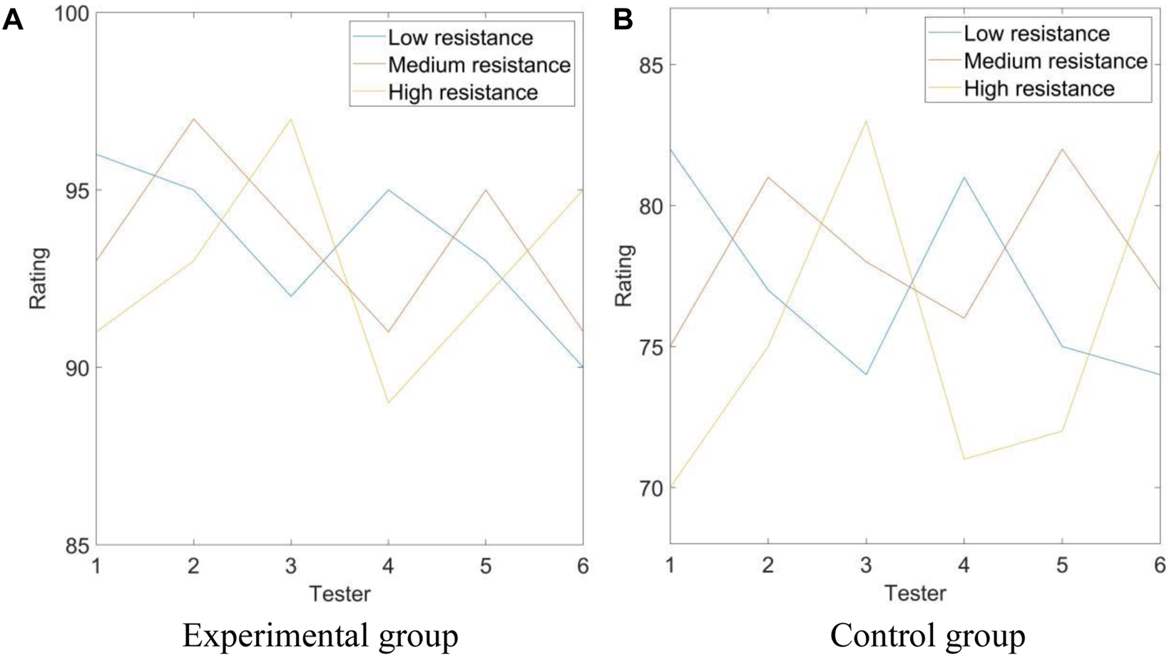 In Figure 2, the x-axis represents the tester, and the y-axis represents the score. The legends show low resistance, medium resistance, and high resistance, respectively.