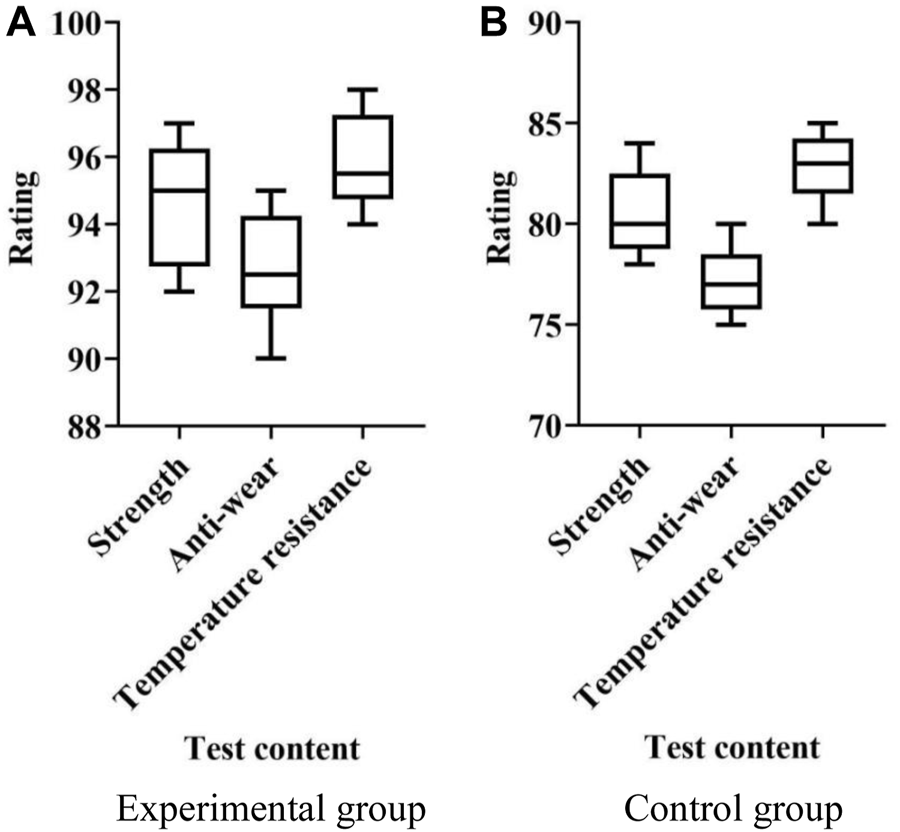 Figure 4A, the strength test scores in the experimental group ranged from 92 to 97 points. In the experimental group, the scores for wear resistance testing ranged from 90 to 95 points. The temperature tolerance test scores in the experimental group ranged from 94 to 98. As shown in