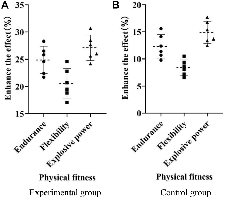 As shown in Figure 5A, after 3 months of training, the testers in the experimental group improved their endurance by 21%–29%; the testers in the experimental group improved their flexibility by 17%–25%; the testers in the experimental group increased their explosive power by 24%–31%. As shown in Figure 5B, after 3 months of training, the testers in the control group improved their endurance by 9%–16%; the testers in the control group improved their flexibility by between 6% and 11%; the testers in the control group increased their explosive power by 12%–18%. As shown in Figure 5, the improvement effect of the experimental group after 3 months of training was higher than that of the control group.
