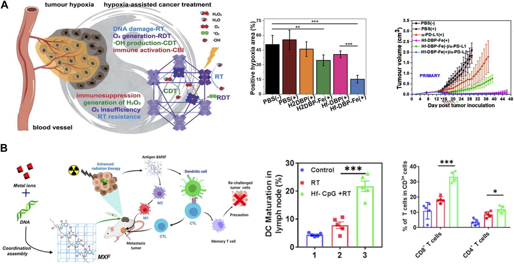 Ni et al. fabricated a biomimetic MOF HF-DPP-Fe with catalase-like activity for immunoradiotherapy (Ni et al., 2020) (Figure 5A). HF-DPP-Fe MOF can catalyze H2O2 to generate oxygen and hydroxyl radicals, thereby improving the hypoxic area of tumor microenvironment, promoting the effect of radiotherapy. The induced hyperimmunogenic tumor microenvironment offers potential for tumor immunotherapy, and the synergistic effect of anti-PD-L1 immune checkpoint blockade not only eliminates primary tumors, but also inhibits the growth of distant tumors. There are also other works using HF-based MOF achieved immunoradiotherapy through different modifications, such as the oxygen delivering by hemoglobin and reprogramming oxygen metabolism in tumor (Sang et al., 2021; Li et al., 2022). In addition, studies have found that radiotherapy can increase the infiltration of T cells, thereby improving the efficacy of immunotherapy. Some small molecular inhibitors of immune checkpoints can be loaded into porous Hf-based MOF structures and realize immunoradiotherapy combination. Lu, et al. loaded IDOi into a Hf-based MOF (IDOi@DBP-Hf), achieved effective growth inhibition and even eradication of local and distal tumors under low-dose irradiation (Lu et al., 2018). The release of IDOi effectively increased the infiltration of functional CD8+ T cells in tumors, overcoming some of the limitations of checkpoint blockade immunotherapy, also demonstrated that Hf-NMs can be used for radiotherapy synergized with immunotherapy and achieve the purpose of simultaneous treatment of primary and metastatic lesions. Apart from combining treatment with immunotherapy, there are also studies focusing on the activation of autologous anti-tumor immunity by radiotherapy. Yang et al. designed a hafnium-based metal “X” frameworks Hf-CpG to induce ICD by enhancing radiotherapy to treat the primary tumor, which promotes innate anti-tumor immunity, such as increasing CD8+ T cells, dendritic cell maturation and M1 polarization of macrophages, achieves the treatment of tumor metastases, and produces long-term anti-tumor immune memory (Yang et al., 2022) (Figure 5B).