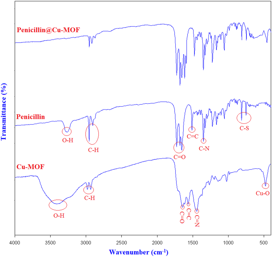 The first technique that was used to characterize and confirm the structures of Cu-MOF and penicillinoate@Cu-MOF was FT-IR spectra (Figure 5).