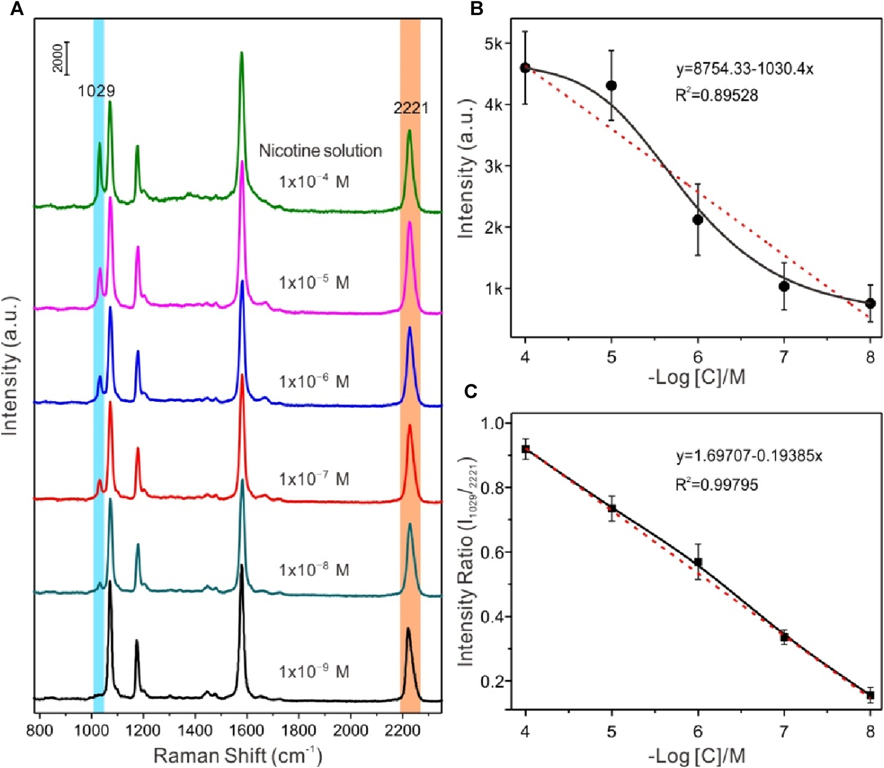 (A) Series of SERS spectra of nicotine in water at different concentrations with liquid-liquid interface self-assembling Au@4-MBN@Ag NPs as the SERS substrates, respectively. (B) and (C) Plot of the SERS intensities at 1029 cm-1versus the snus concentration over a large concentration range.