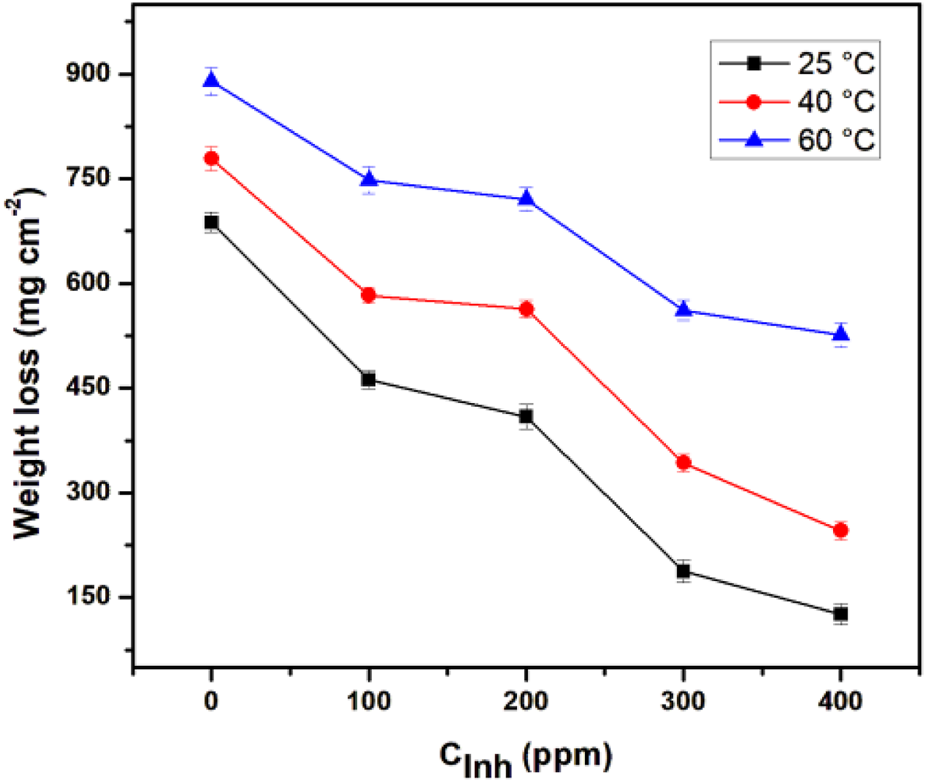 When the inhibitor concentration was increased, the weight loss was considerably less. However, increased weight loss was observed when the temperature increased; this effect is associated with the decomposition or degradation of the inhibitor.