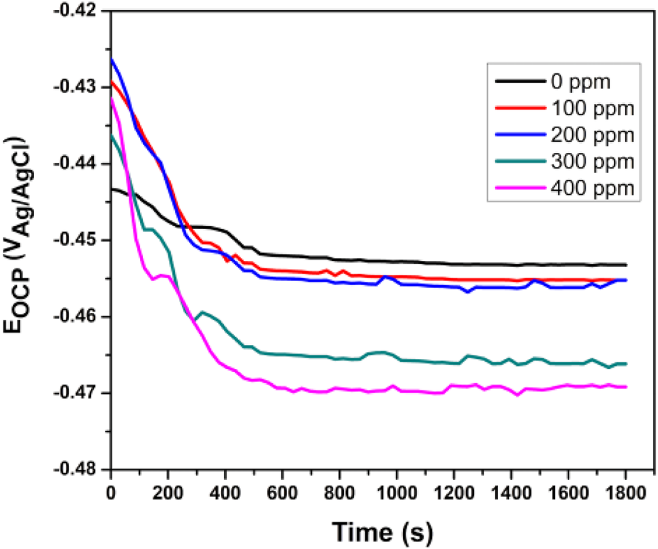 Evolution of open-circuit potential (OCP) versus time for Tradescantia spathacea as a green corrosion inhibitor of API 5L X52 steel in 0.5 M H2SO4 at 25°C.