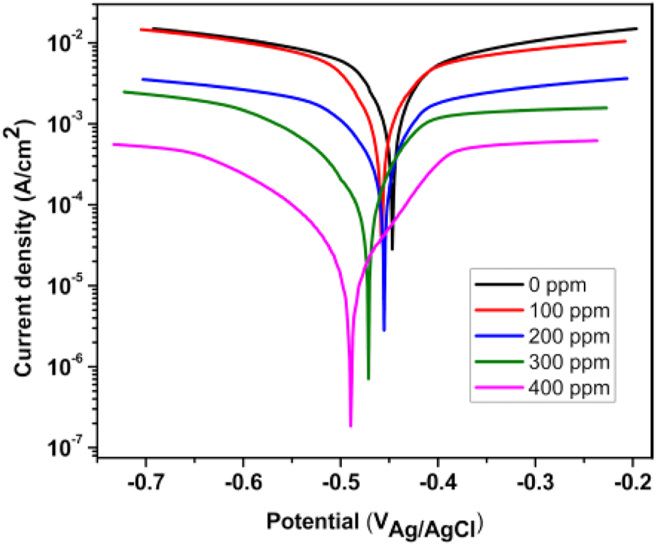 The stabilized OCP was measured after 1800 s of exposure. Figure 5 shows API5L X52 steel OCP values of 0.5 M H2SO4 at 25°C with no inhibitor and with different inhibitor concentrations. When the inhibitor was added, the potential was displaced to more negative values. However, it was not as large as −85 mV, and therefore, the inhibitor could not be categorized as a cathodic or anodic type (Hamdy et al., 2013). The stabilized OCP for the blank was −452 mV, while the potential with the inhibitor was between −454 mV and −469 mV. Equilibrium was reached after 600 s in all tests.
