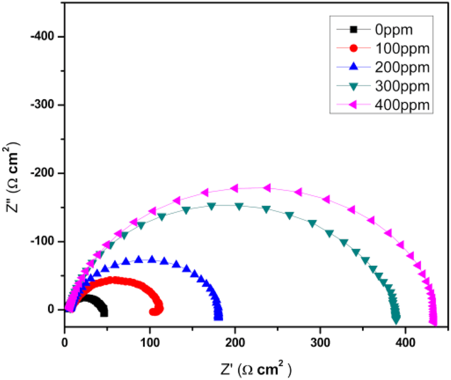 Figure 7 shows the Nyquist diagrams for the function of T. spathacea concentration as a green corrosion inhibitor of API 5L X52 steel in 0.5 M H2SO4 at 25°C. For the blank, uninhibited solution, the Nyquist plot described a single and depressed capacitive-like semicircle at all frequency values, with its center on the real axis, indicating that the corrosion process was under charge transfer control from the metal to the electrolyte through the double electrochemical layer. In fact, the semicircle diameter increased, indicating the best corrosion resistance of the protective film.