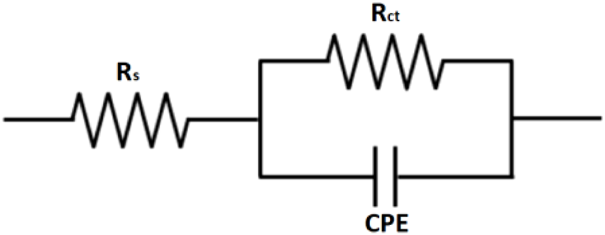 Equivalent circuit used for fitting the obtained data by EIS from API 5L X52 steel in 0.5 M H2SO4 at 25°C, without and with a corrosion inhibitor.