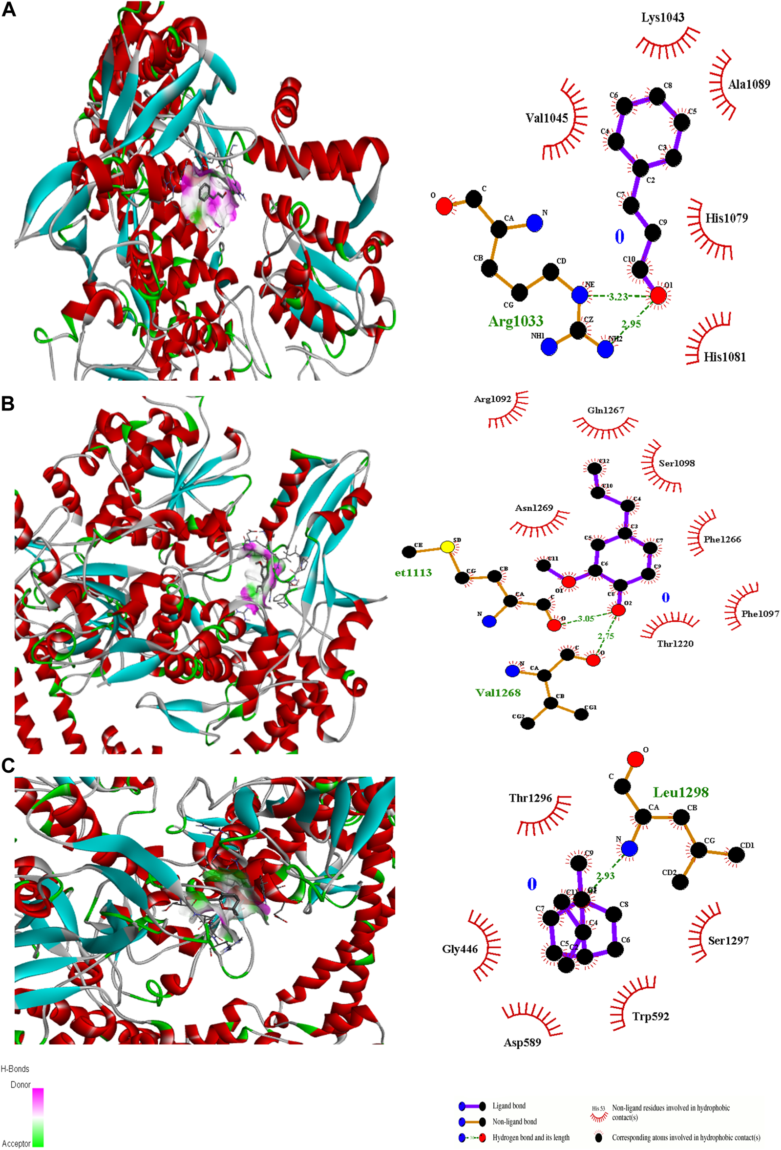 3D interactions of Cinnamaldehyde (A) (Pose 1), eugenol (B) (pose 1) and cineol (C) (Pose 6) with 2Q0J binding site.