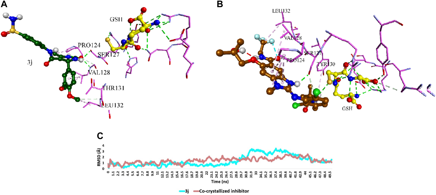 To explore the potential interactions of compound 3j with the target proteins mPGES-1 and 5-LO, we created their structural models and performed molecular docking simulations using the crystalline structures of these proteins (PDB ID, 4 bpm and 6 n2w, respectively) as reported by Li et al, (2014) and Gilbert et al, (2020). For mPGES-1 (PDB ID, 4 bpm), our strategy involved docking compound 3j at the site occupied by a co-crystallized inhibitor, rather than the glutathione (GSH) binding site, due to the latter’s strong affinity and resistance to displacement by other inhibitors, as discussed by Li et al, (2014) and Koeberle and Werz, (2018). The docking protocol was validated by re-docking the co-crystalized ligands into the active sites of both enzymes (i.e., mPGES-1 and 5-LO, respectively). The resulting top-scoring poses of both ligands were in good alignment with the co-crystalized ones with slight deviations (RMSDs = 1.27 and 1.04, respectively). Superposition of the co-crystallized ligands of both enzymes is illustrated in Figure 4. The docking results, illustrated in Figure 5, reveal that the preferred orientation of 3j was comparable to the binding behavior of the co-crystallized inhibitor, engaging in a hydrogen bond with SER-127 and hydrophobic contacts with LEU-132 and PRO-124, alongside an additional hydrogen bond with PRO-124’s backbone.