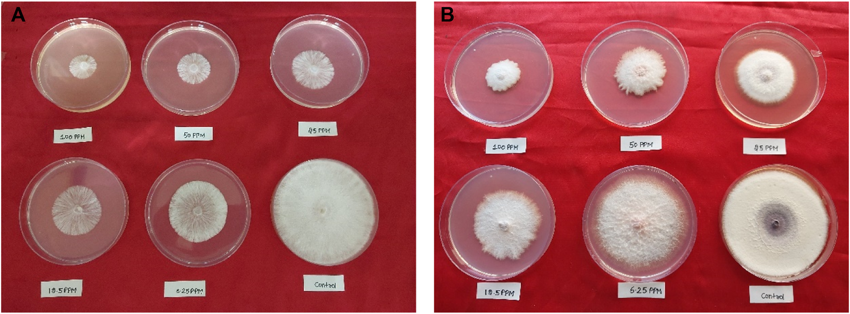 During the incubation period, regular observations were recorded for both the treatment and control Petri plates. The percentage inhibition was then calculated using Abbott’s formula (Abbott, 1925), which is a commonly used method to quantify the antifungal activity of a test compound, as follows:where I represents percentage inhibition and CF = [(90-C)/C] × 100, with 90 being the diameter (mm) of the Petri plate and C being the growth of the fungus (mm) in the control.
