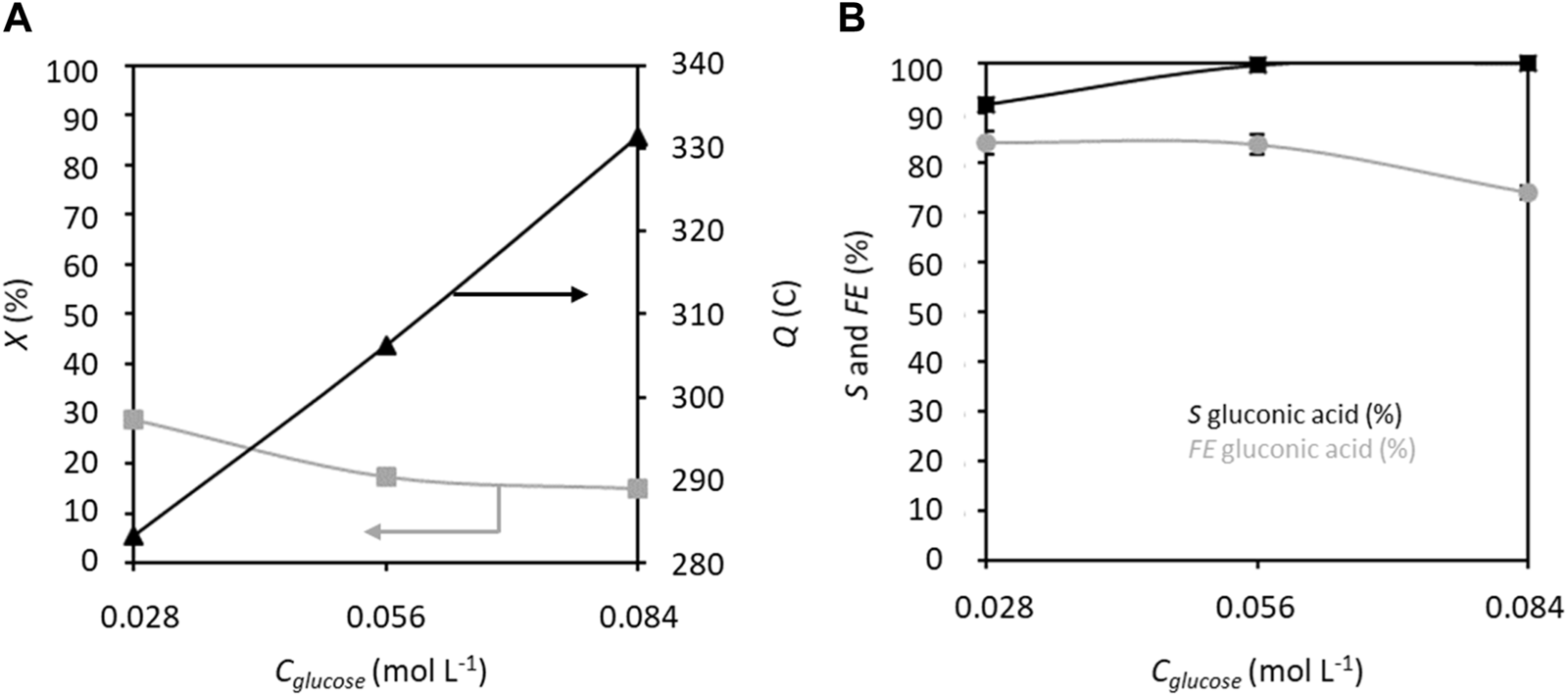 (A) Conversion rate X and electricity consumed Q, and (B) selectivity S and faradaic efficiency FE in gluconic acid as functions of TEMPO concentration (% mol/glucose); Cglucose = 0.028 mol L−1, CK2CO3 = 0.2 mol L−1, applied anode potential = 1.32 V vs. RHE, electrolysis time = 5 h, and flow rate = 100 mL min−1 (T = 20°C). The counter electrode is a nickel foam of size 40 × 44 mm2 and thickness 1.6 mm.