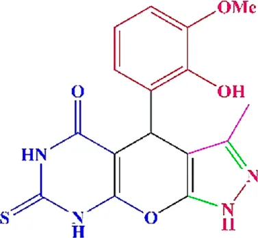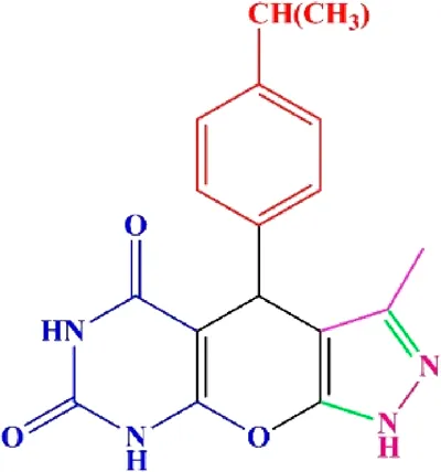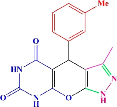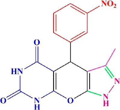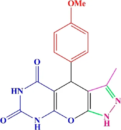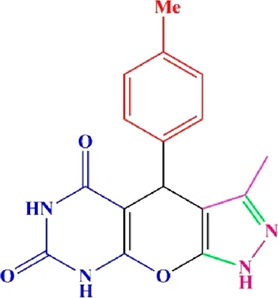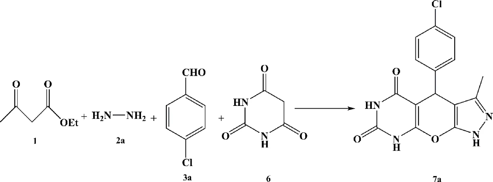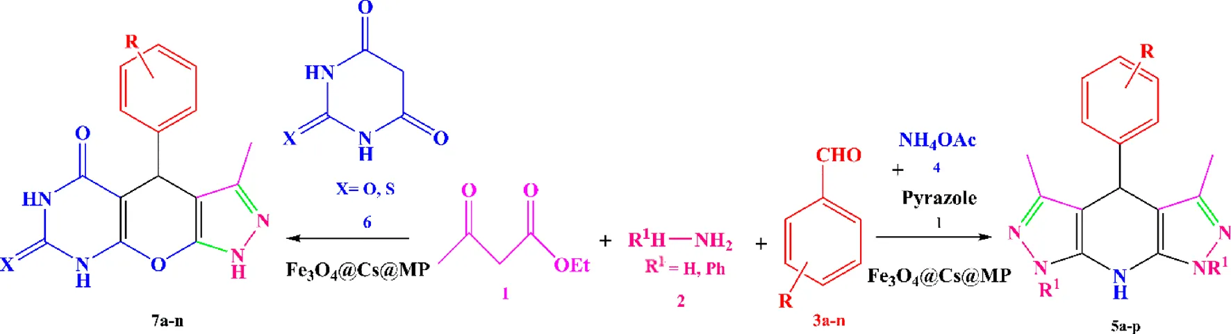 In a lab tube, hydrazine hydrate (1 mmol), ethyl 3-oxobutanoate (1 mmol), aldehyde derivative (1 mmol), barbituric acid (1 mmol), and Fe3O4@Cs-MP (0.02 g) were added in ethanol-water solvent pair at 50°C. The reaction development was determined by the formation of the precipitate and by TLC (Eluent: ethyl acetate: n-hexane 2:8). After the process was completed, the magnetic catalyst was pulled out. Finally, the filtered organic products were leached with ethanol and dichloromethane and recrystallized in ethanol if necessary. In the end, product was dried at 80°C.