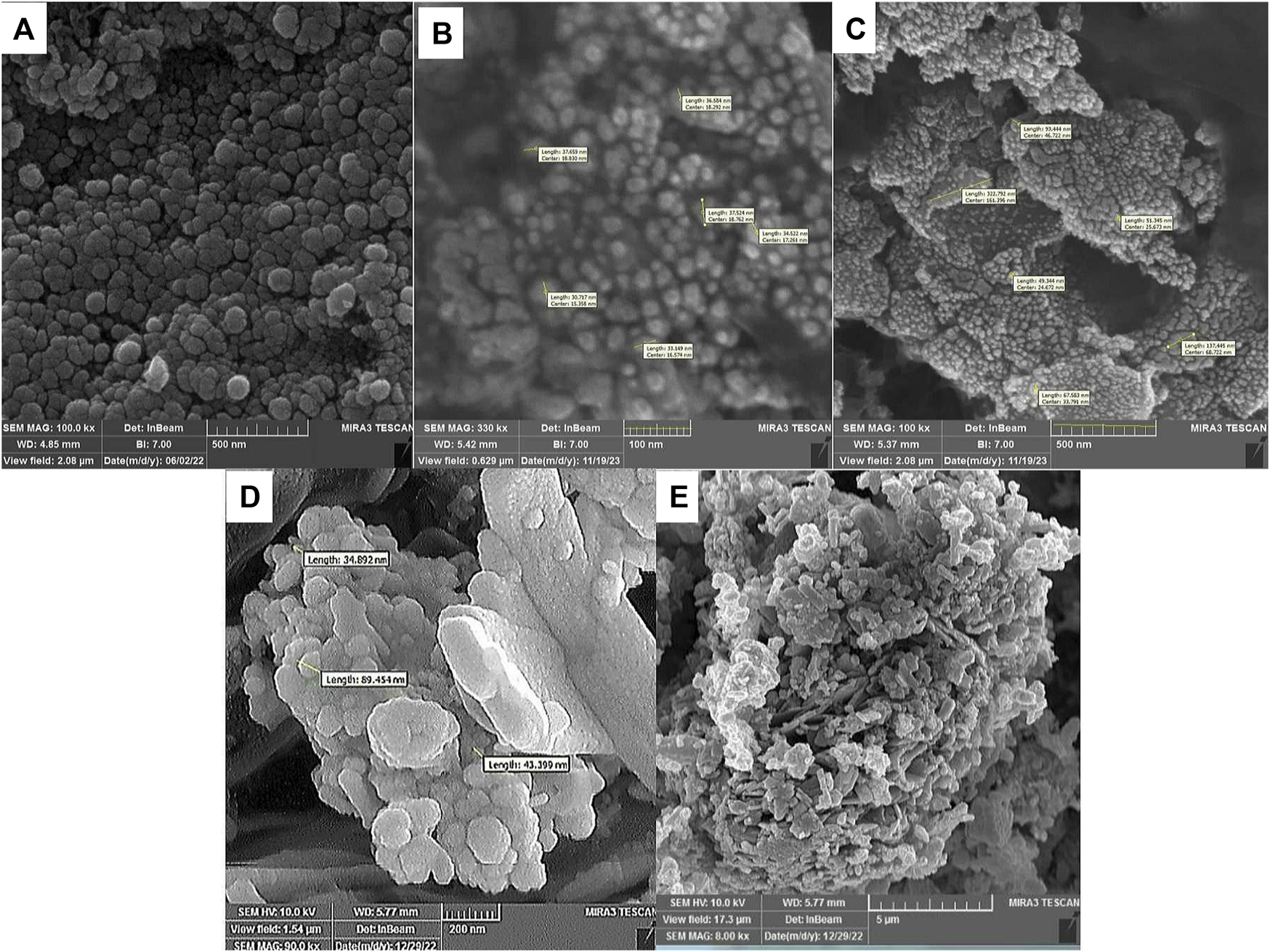 SEM and TEM techniques are used to determine the characteristics of the surface, morphology, and texture of the composite (Daraie et al., 2021; Xue et al., 2021; Karimi-Nami et al., 2023). Figure 5 presents the FE-SEM results at each stage of catalyst fabrication. The SEM micrograph of the magnetic nanoparticles reveals a semi-spherical shape for bare Fe3O4. Upon examining the FE-SEM image of the Fe3O4@Cs nano-catalyst, it becomes evident that the nano-catalysts are uniformly affixed to the chitosan surface and has homomorphic texture. Notably, the uneven and porous surface observed in Fe3O4@Cs-MP, coupled with the discernible increase in nanoparticle size, serves to confirm the attachment of MP to the magnetic matrix. This active surface is one of the virtues of the prepared catalyst.