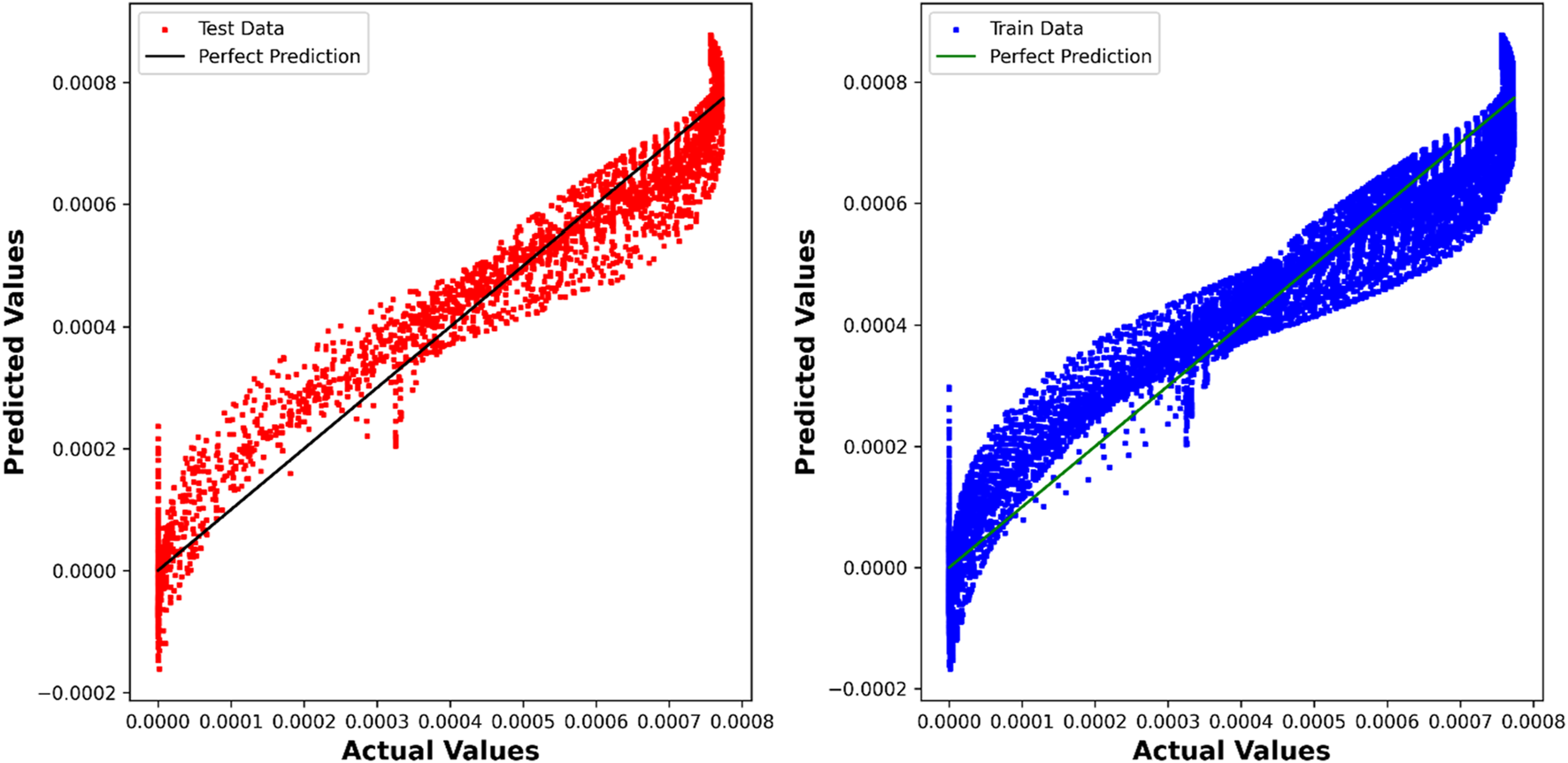 While the PAR model demonstrates a slightly lower R2 score of 0.94652, its performance remains commendable, with competitive RMSE, MAE, and Max Error values. This indicates the model’s effectiveness in capturing relationships within the dataset, albeit with a nuanced trade-off between accuracy and complexity. In Figure 5, a visual comparison is presented, illustrating the disparities between the values predicted by the PAR model and the actual values.