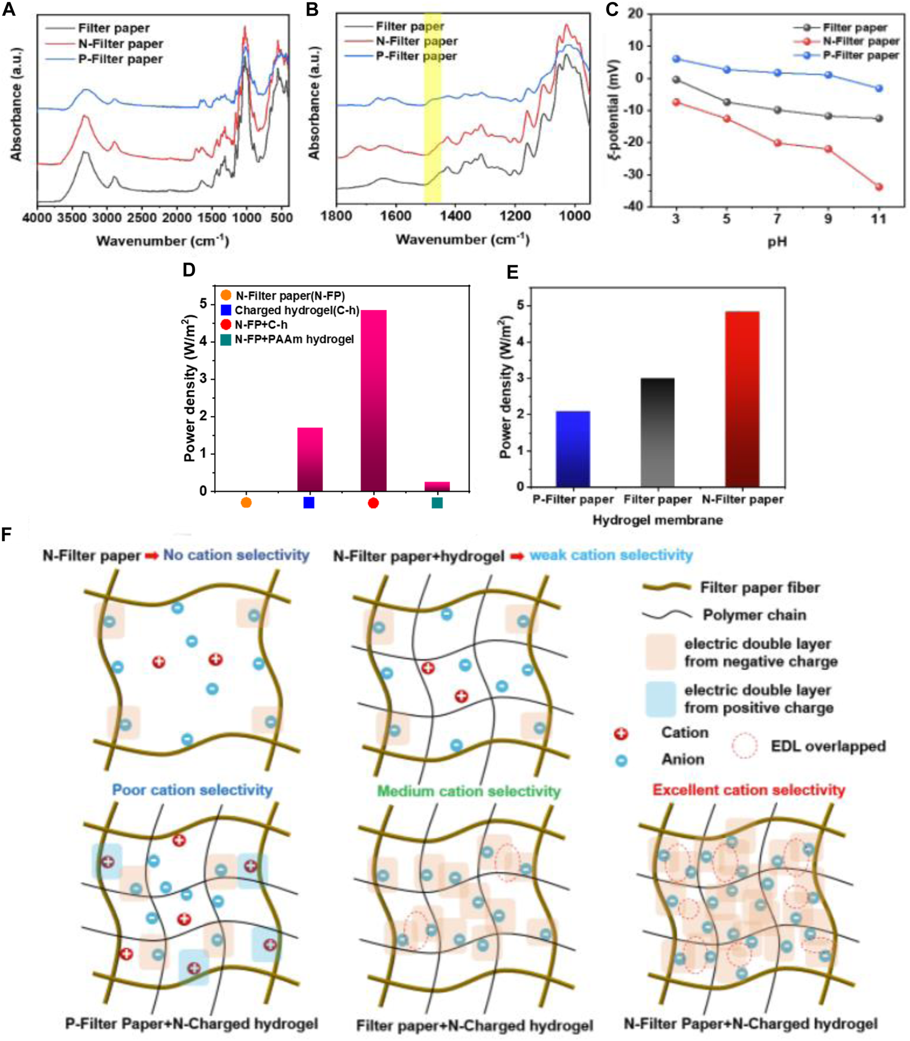 (A,B) The FT-IR characterization of different filter-paper samples; (C) The zeta-potential of different filter-paper samples; (D) Power density of four kinds of membranes; (E) Power density of membranes with different filter-paper samples; (F) The schematic illustration of the surface-space charge synergies model.