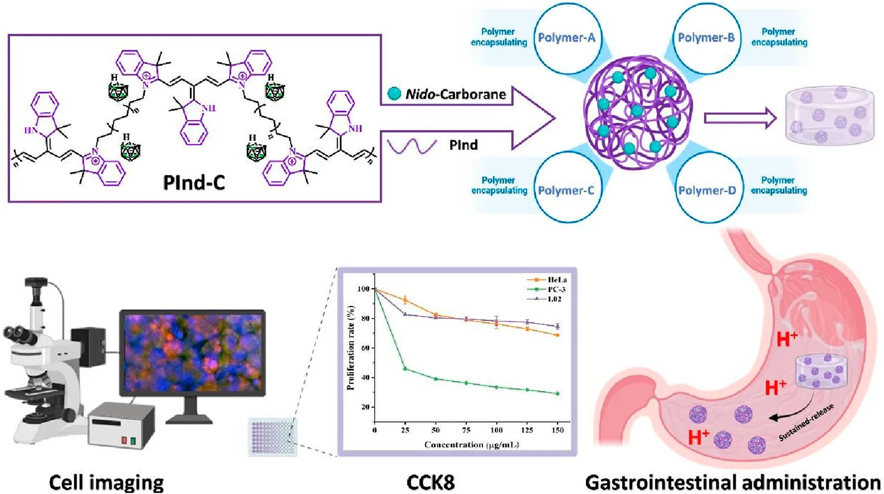 In this paper, we combine the above aspects to address the poor bioavailability of carborane. We modify the fat-soluble o-carborane into a water-soluble nido-carborane by alkali treatment. Additionally, we synthesize a polyindole fluorescent dye to label the nido-carborane. Finally, four polymeric nanomaterials were designed and synthesized for encapsulation with the objective of enhancing the biocompatibility of the drug and achieving a slow release in different gastrointestinal environments. This research aims to enable the development of simple and practical boron-containing fluorescent drugs as well as to improve the functionality of nanomedicine.