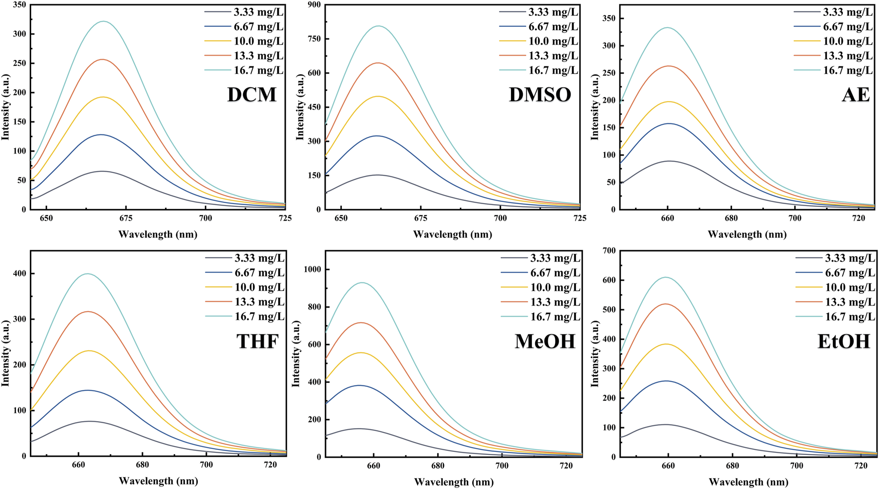 To investigate the photophysical properties of PInd-C, we selected six solvents with different polarities, including DCM, DMSO, AE, THF, MeOH, and EtOH, and performed UV and fluorescence spectroscopy measurements on it. The experimental results indicate that among these six solvents, the UV spectrum of PInd-C exhibits identical double-peak characteristics within the range of 525–580 nm, with its maximum absorption peak located between 567 and 574 nm. Under the same concentration conditions, PInd- C exhibits the highest absorbance in the DCM solvent, while the absorbance in the other five solvents remains relatively consistent. Additionally, the emission wavelengths of PInd-C in the six solvents are concentrated within the range of 656–668 nm. In particular, PInd-C shows the highest fluorescence absorption intensity in the MeOH solvent. Furthermore, we observed that both the absorbance and fluorescence intensity of PInd-C increase with the increase of concentration. (Figures 3–5; Table 1).