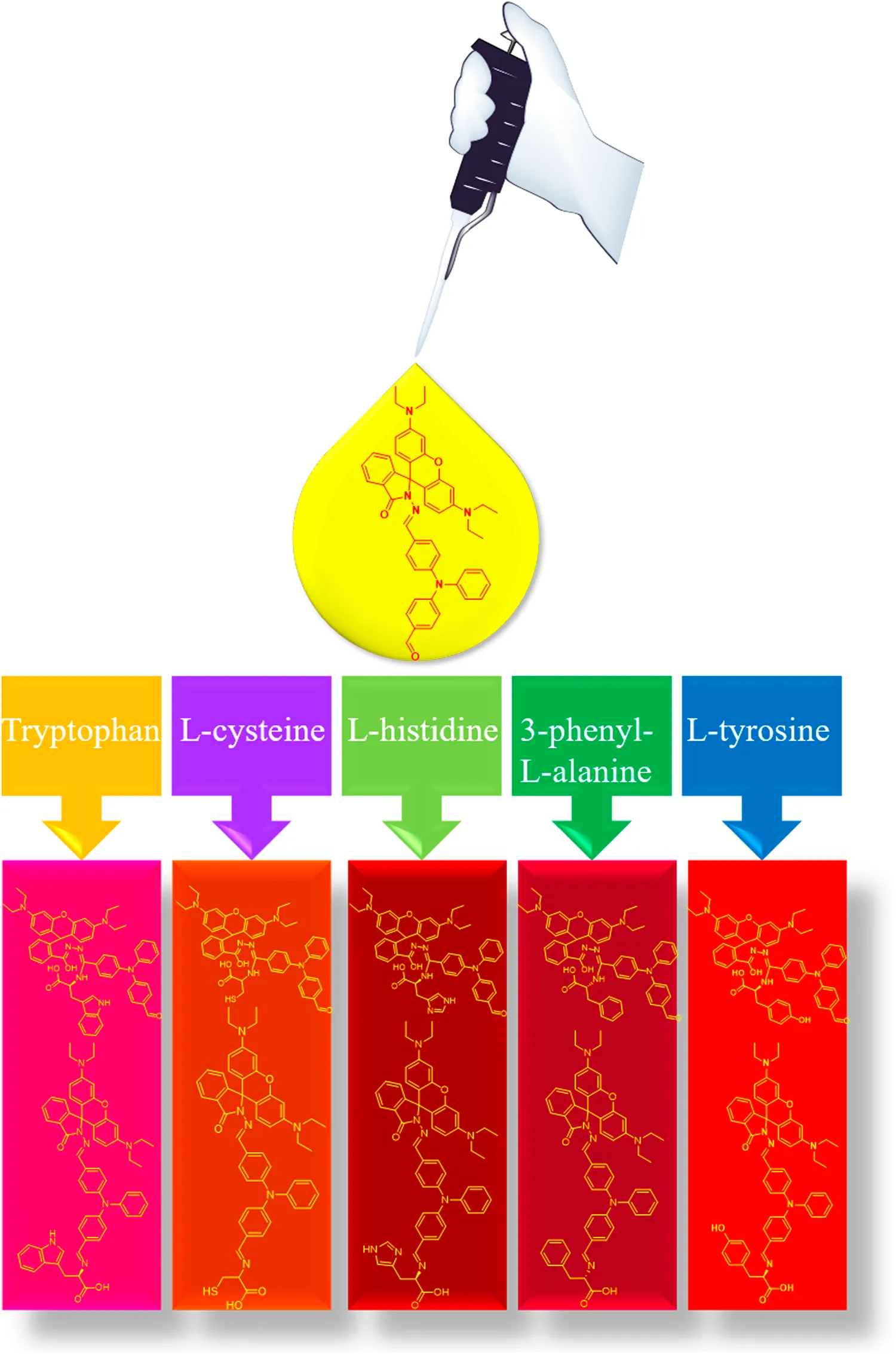 Currently, an imbalance in amino acids is responsible for about 300 different types of illnesses, including immune system disorders, cancers, viral diseases, nervous system disorders, and geriatric diseases (Yin et al., 2024; Lu et al., 2024). The body’s imbalance of amino acids can give information about a wide range of linked disorders as well as a thorough and dynamic evaluation of the levels of neurotransmitter metabolism, urea cycle, and amino acid functional metabolism. Additionally, early risk assessment may be carried out for malignant and chronic illnesses (Xiao et al., 2020; Deng et al., 2024; Fan et al., 2024). At present, major medical institutions mainly detect small molecule substances such as amino acids through full spectrum amino acid detection LC-MS/MS technology and small molecule fluorescent probe used in laboratories (Deng et al., 2021; Wang et al., 2021; Zhao et al., 2024; Shao et al., 2022; Schumann et al., 2023). Such as formaldehyde titration method: this method is simple to operate and has high accuracy, but it is prone to interference by other acidic substances. High performance liquid chromatography: This method has good separation effect, high sensitivity, and can detect a variety of amino acids at the same time. However, the operation is complicated, the cost is high, and the use of organic solvents is required. Although they have high sensitivity and fast detection speed, their equipment requirements are high, the fluorescence effect is poor, and the rapid and immediate detection of different amino acids cannot be visually monitored (Ye et al., 2024; Hu et al., 2022; Hao et al., 2024). Therefore, how to develop an efficient, qualitative and rapid visualization fluorescent probe to solve this difficulty has important value and significance (Rong et al., 2024).