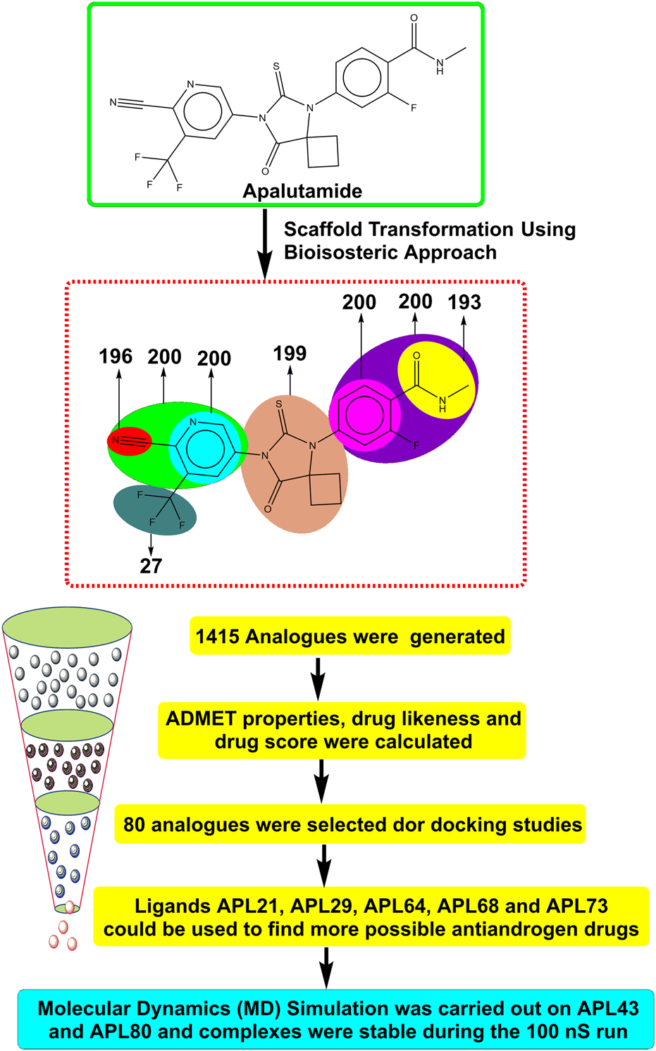 Results: We generated a total of 1,415 analogues for different groups of APL using the bioisosteric approach. We selected 80 bioisosteres based on pharmacokinetic profiles, DL and DS score predictions, and found that the designed APL bioisosteres were optimal to good compared to APL. Analogues APL19, APL35, APL43, APL76, and APL80, formed hydrogen bonds with protein (PDB ID: 5T8E) which is similar hydrogen bonding to the standard (APL). The MD simulation result confirmed that APL43 and APL80 complexes were stable during the 100 nS run.