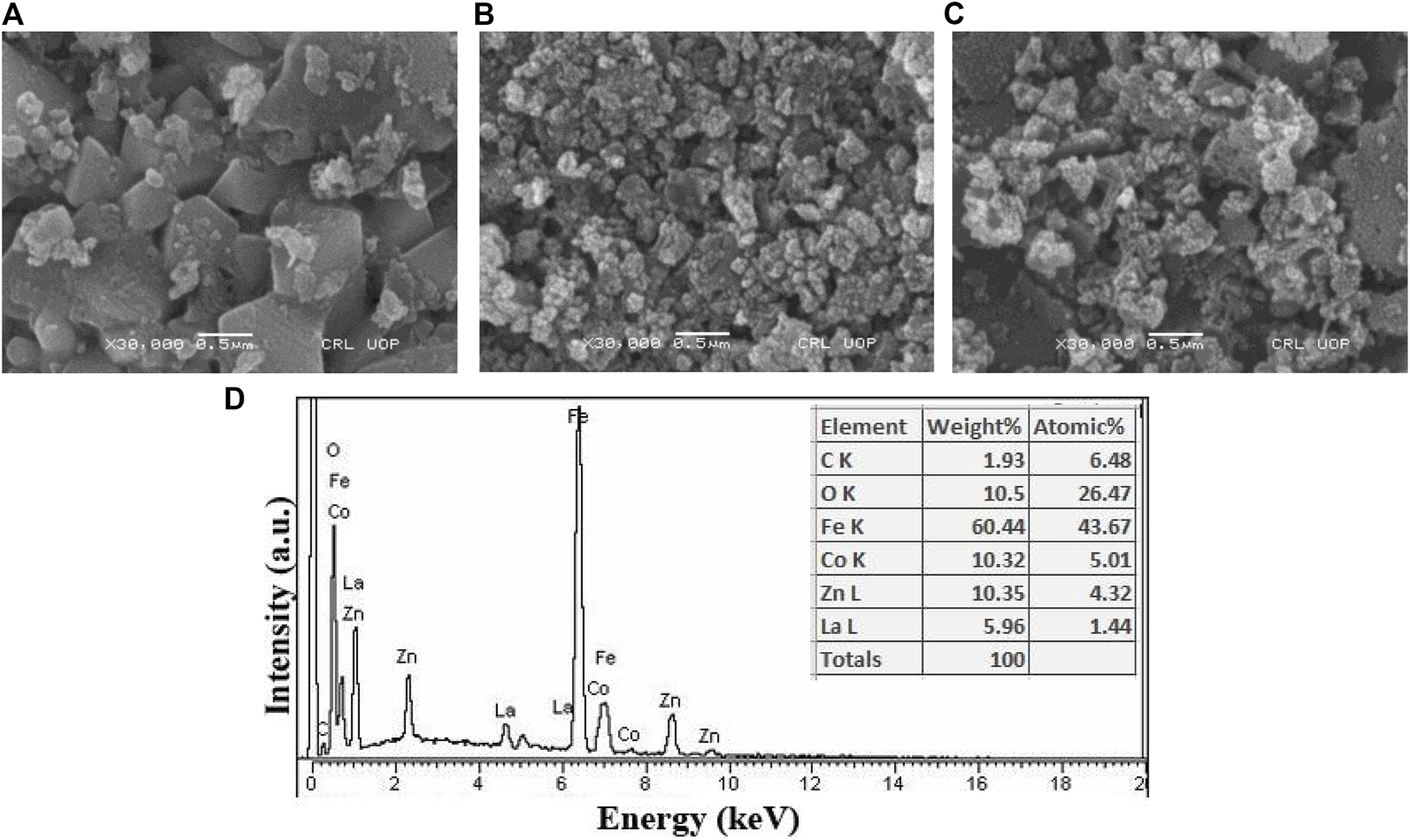 The X-ray diffractometer (XRD), which operated with a precise wavelength (λ) of 0.154 nm and covered a 2θ range spanning from 20° to 80°, was utilized for capturing diffraction patterns. The scanning electron microscope played a pivotal role in elucidating external appearance and crystallographic structure. FTIR spectroscopy, specifically using a Perkin instrument, was employed to validate the absorption bands (ν1, ν2) within the wavenumber range of 4,000 to 400 cm⁻1. The samples’ absorption spectra were documented employing the UV-Vis spectrophotometer PG (Model T-80). Dielectric measurements were performed at room temperature (RT) using the IM-3536 series LCR Meter and Impedance Analyzer. Lastly, a VSM investigation was conducted to ascertain the M-H hysteresis loops of Co0.5Zn0.5LaxFe2-xO4.