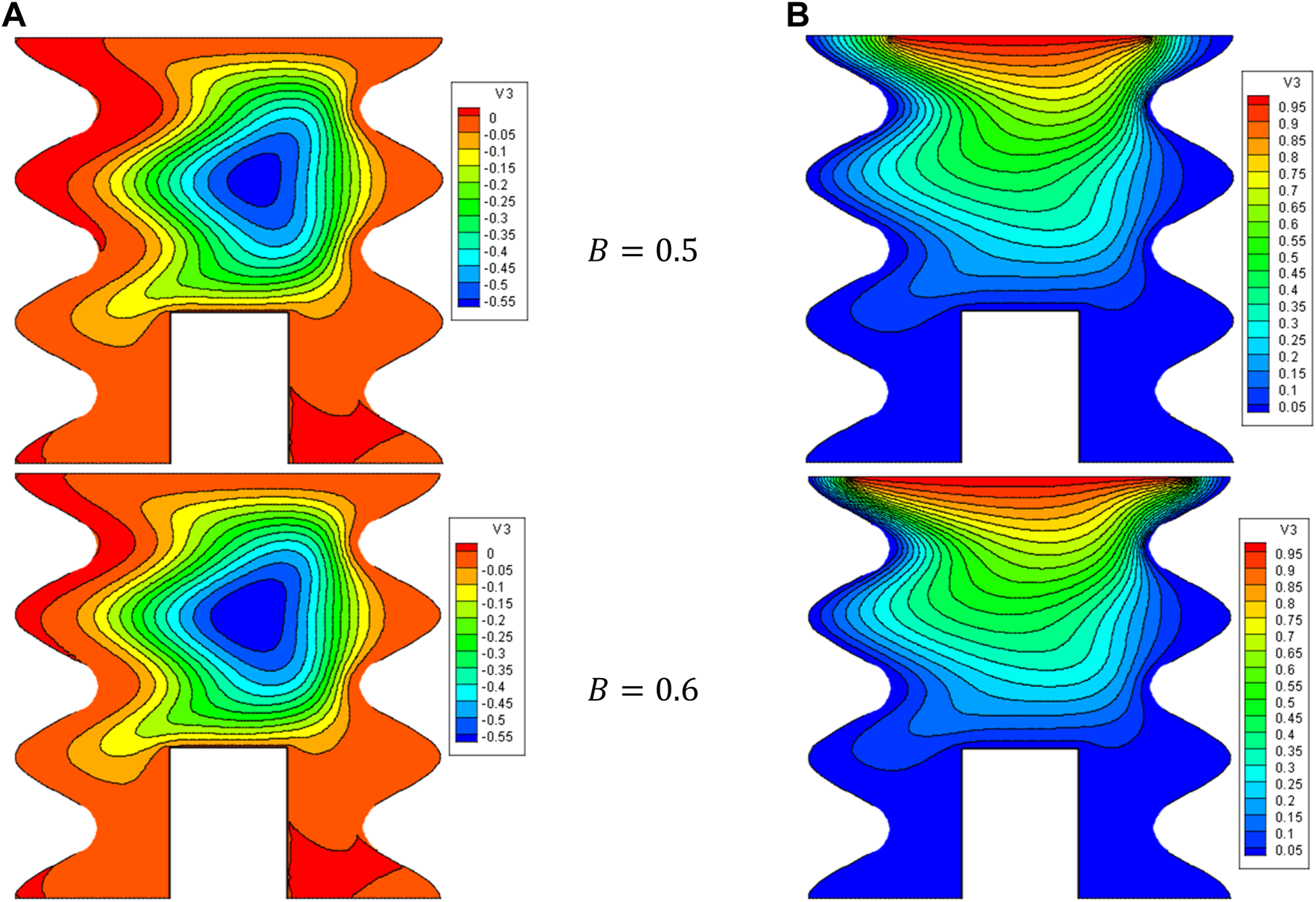 Figures 5, 6 illustrate the impact of the B on the stream function, isotherms, and Nulocal - Nuavg in specific conditions as follows: