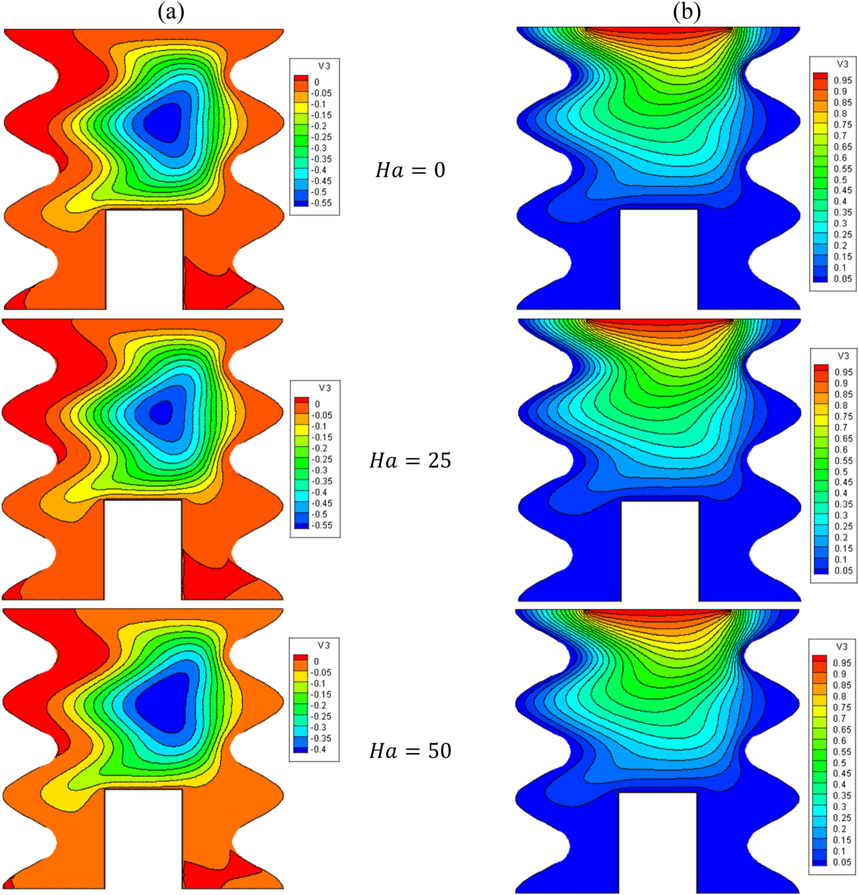 Figure 3 presents the effects varying the sinusoidal amplitude of the left and right boundaries (A) on the flow structure (stream function) and temperature field (isotherms) for .