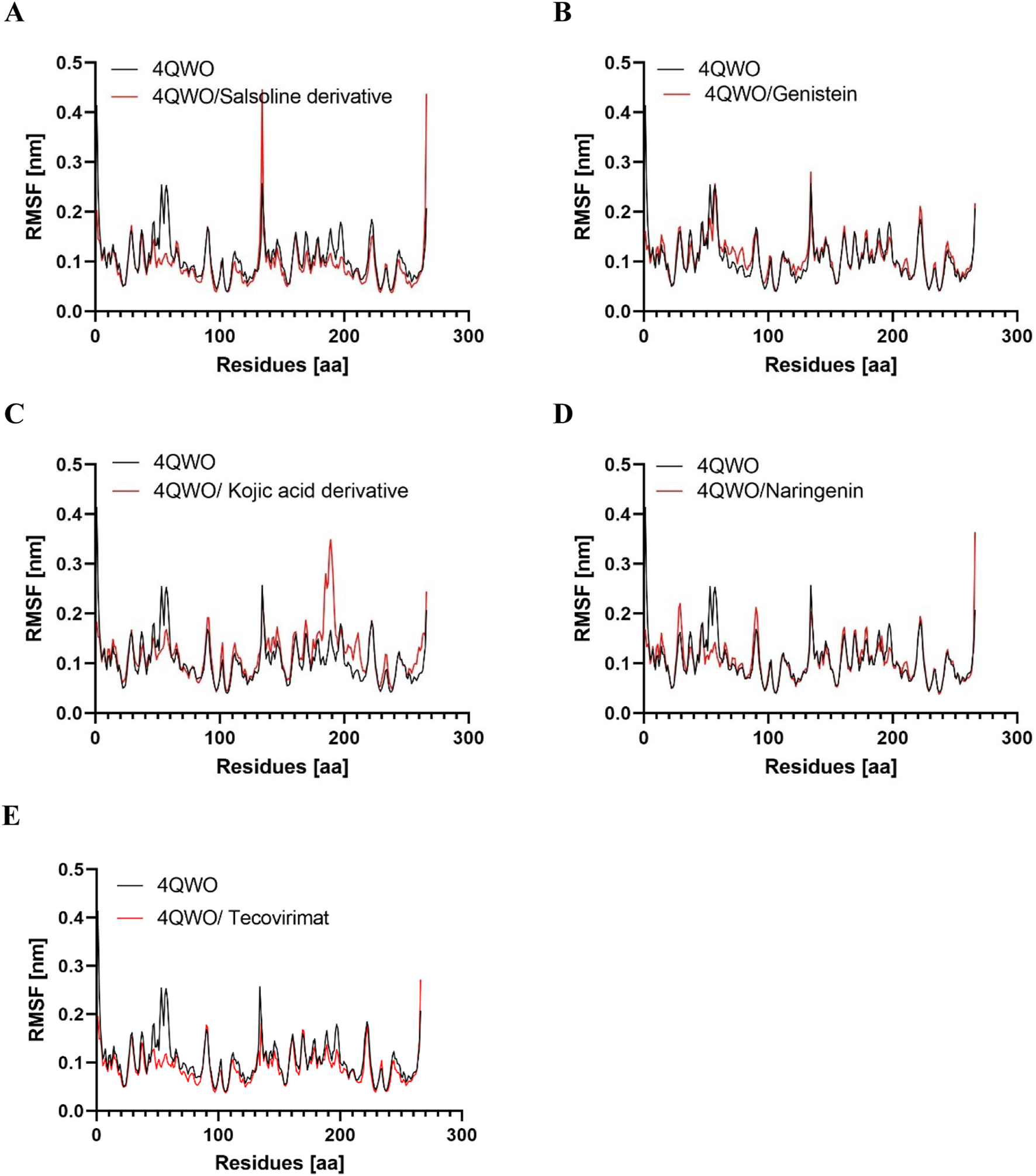 Figure 5. Root mean square deviation (RMSF) values of 4QWO alone and in complex with (A) Salsoline derivative, (B) Genistein, (C) Semisynthetic derivative of kojic acid, (D) Naringenin, and (E) Tecovirimat vs. the number of residues.
