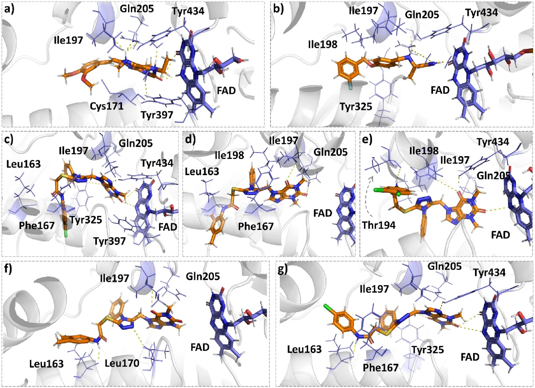 | MAO-B16 | Ile197, Tyr397, and Tyr434 | Met121 (2), Leu170 (3), Cys171 (2), Phe184(2), Leu185, Val188, Val188(2), Ile197 (2), Ile198, Ile315, Tyr325 (2), Phe342, Tyr397 (2), Tyr434, and FAD501 | Phe167(S), Cys171(S), and Phe184(Cl) |