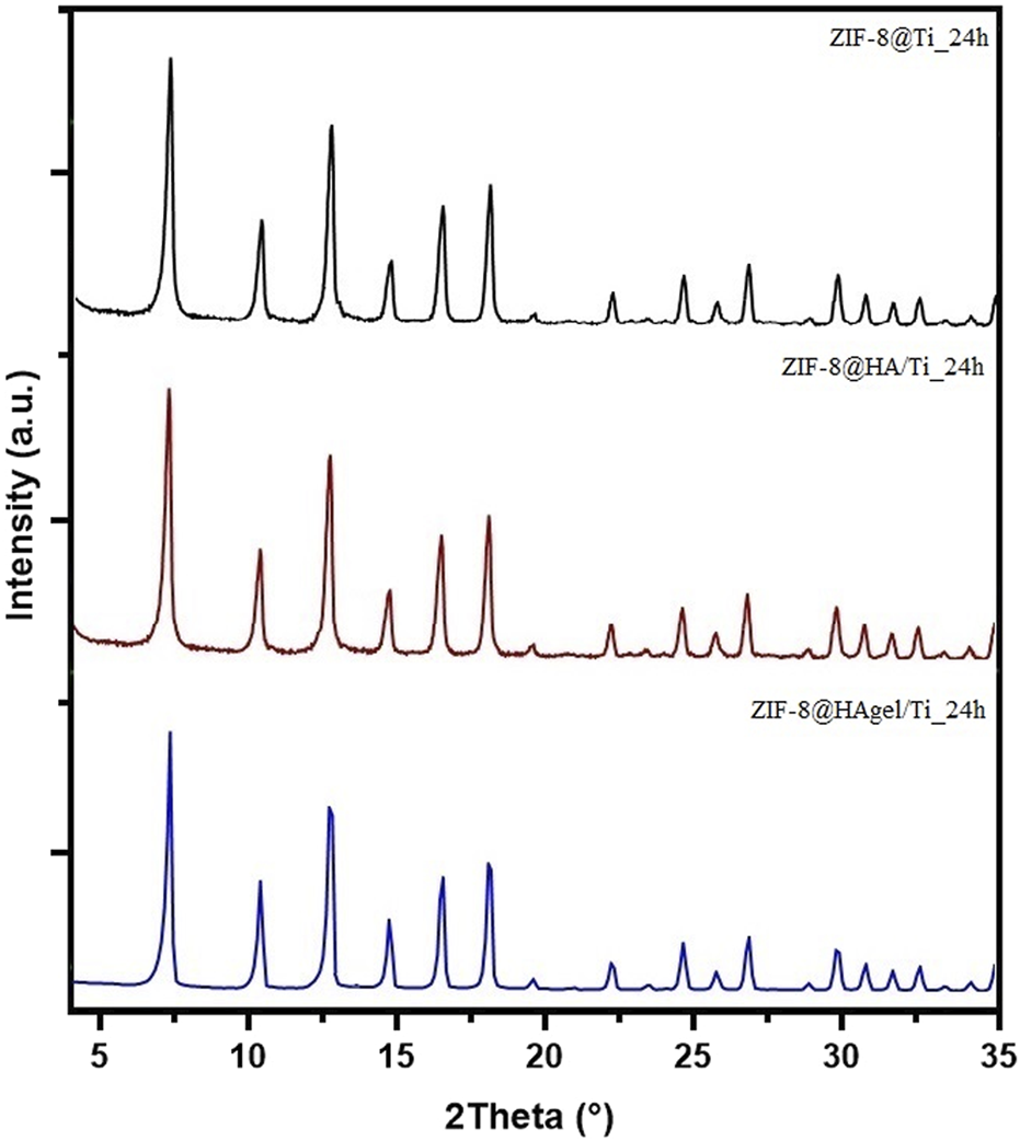 PXRD patterns of the ZIF-8@Ti_24h (black), ZIF-8@HA/Ti_24h (red), and ZIF-8@HAgel/Ti_24h (blue) samples.