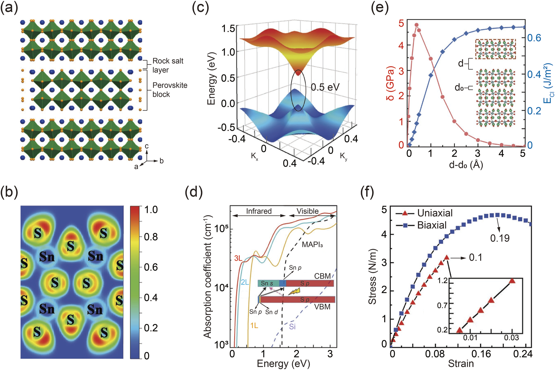 Figure 5. (A) Schematic packing configuration of R-P chalcogenide perovskites. Reprinted with permission from Ref (Niu et al., 2018a). Copyright 2018, American Chemical Society. (B) Simulated Sn-S bonding feature in R-P Ca3Sn2S7. (C) Three-dimensional band structure and corresponding bandgap of Ca3Sn2S7. (D) Calculated absorption behavior of R-P Ca3Sn2S7. (E) Calculated cleavage energy ECl and corresponding cleavage strength σ, varied by the distance of d-d0. (F) Stress evolution as a function of strain in R-P Ca3Sn2S7 under uniaxial and biaxial modes. Reprinted with permission from Ref (Du and Shi, 2019). Copyright 2019, Wiley.