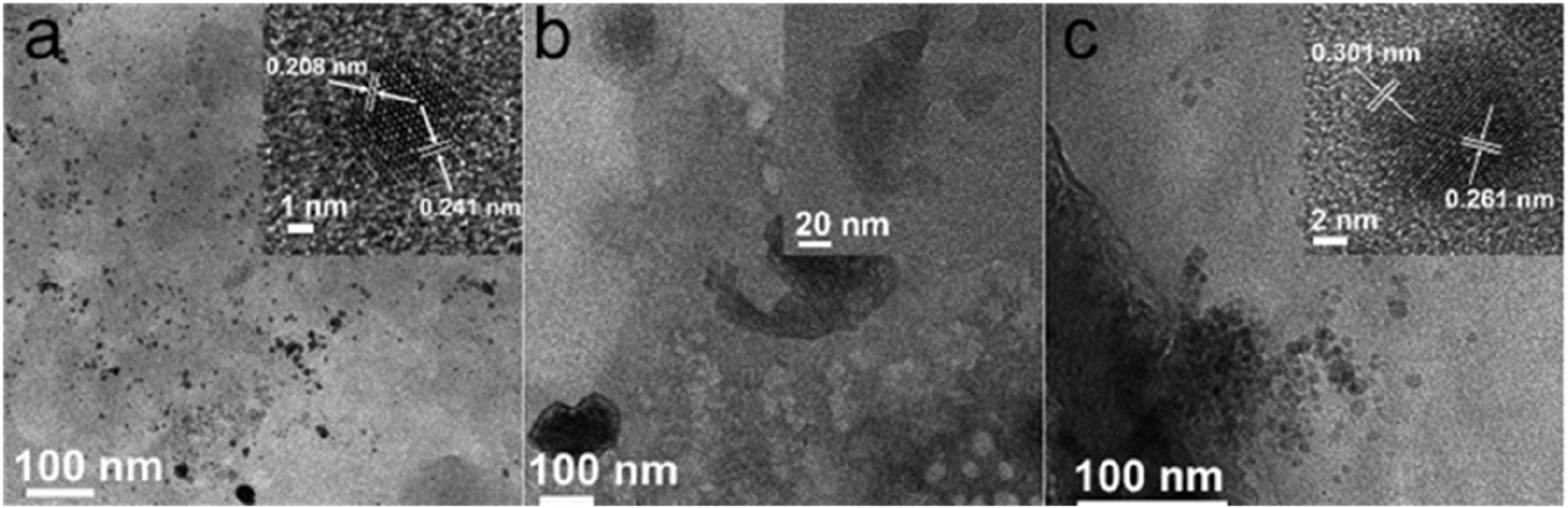 TEM phrotographs of (A) CoPor@GPF, (B) CoPht@GPF, and (C) CoVB12@GPF. Insets are higher magnification images, which demonstrate either crystal lattice or enlarged details.