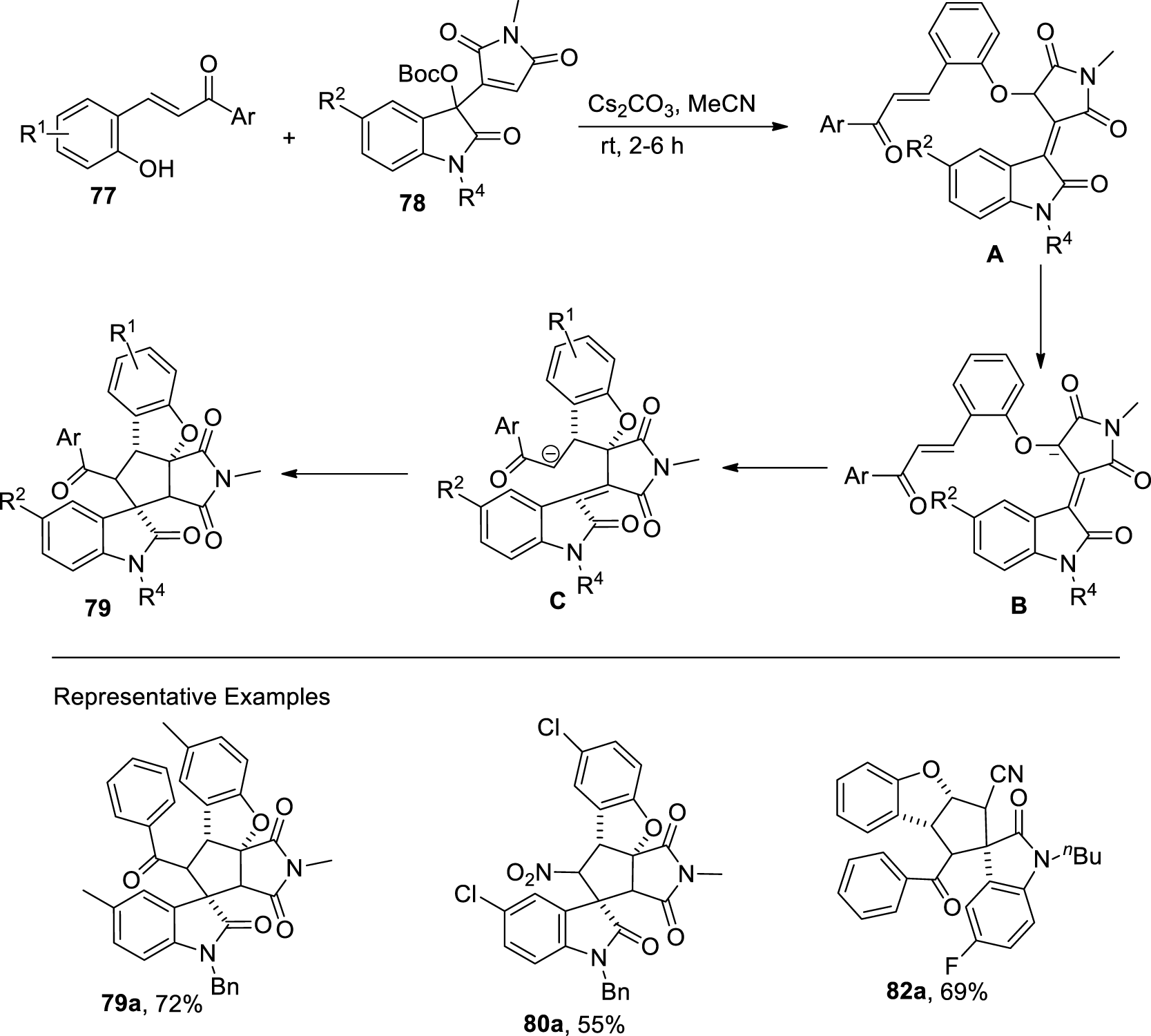 Wang et al. (2022) disclosed a base that is a cesium carbonate-mediated reaction of β-nitro-ortho-hydroxystyrenes (EWG = NO2)/ortho-hydroxychalcones (EWG = COAr) 77 with Morita−Baylis−Hillman (MBH) maleimides 78 and nitriles 81 of isatin via cascade annulation to access dihydrobenzofuran-spirooxindole motifs 79, 80, and 82, respectively. The reaction was carried out in MeCN (as a solvent) for approximately 2 h to obtain a maximum yield of 89%. In this domino reaction, phenolates of hydroxychalcones/hydroxystyrenes 77 attacked at the α-position of MBH maleimides/nitriles 78 or 81 to result in the formation of an intermediate, which underwent a double Michael addition reaction to give final products 79, 80, and 82, respectively (Scheme 20) (Figure 5).