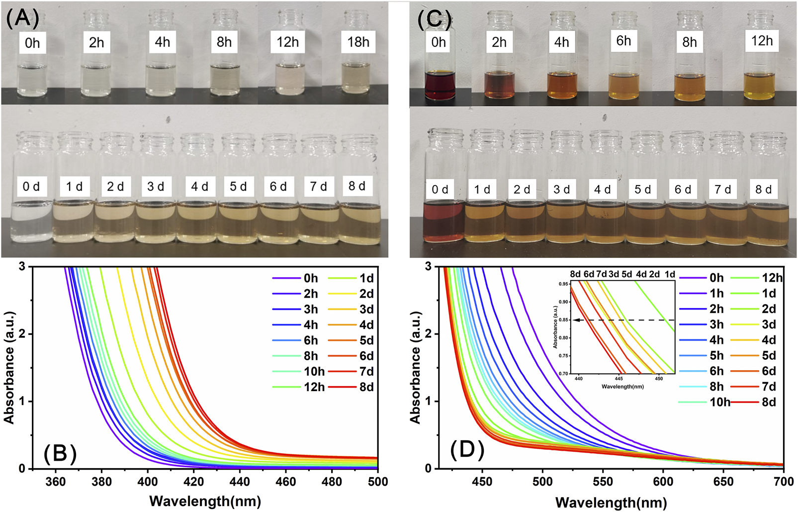 Figure 5. The evolution of the color (A, C) and UV-Vis spectra (B, D) of the DMF solutions of Precipitate-1 (A, B) and Precipitate-2 (C, D) over time.